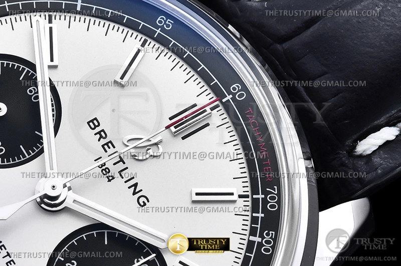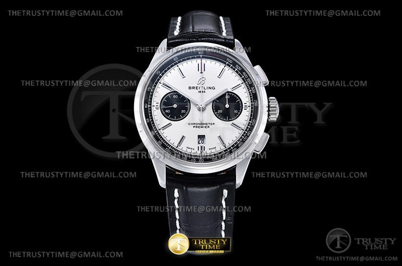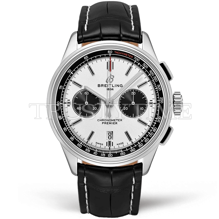 Часы Breitling из коллекции Premier Chronograph. Спортивные мужские часы Breitling Premier B01 Chronograph 42 AB0118221G1P1 премиального качества (Артикул магазина: BT-0466) оснащены надежным автоматическим механизмом с автоподзаводом (работает от амплитуды движения руки) калибра Valjoux-7750, в котором реализованы следующие функции: часовая, минутная и секундная стрелки, а так же хронограф, дата. Круглый корпус часов стального цвета, имеющий размер 42 мм и высоту 15 мм превосходно дополнит образ и украсит запястье своего обладателя. Для изготовления часов Breitling Premier B01 Chronograph 42 AB0118221G1P1 предлагаемых в нашем интернет-магазине, применяются нержавеющая сталь 316F высокого качества (Швейцарский стандарт), а так же сапфировое стекло высокой прочности, благодаря чему обеспечивается максимальная защита от сколов и механических повреждений. Отличительной чертой данной модели является белый циферблат, часовые индексы которого обеспечивают часовые метки. Завершает образ кожаный ремешок черного цвета с фирменной раскладывающейся застежкой Breitling. Водонепроницаемость данной модели составляет 30М (WR30) – допускается минимальное воздействие с водой.