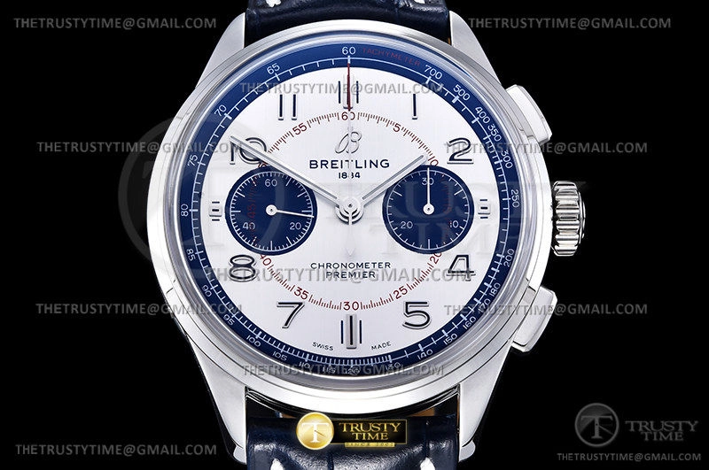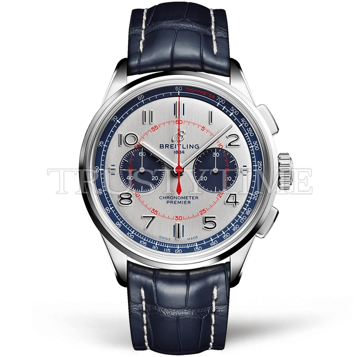 Часы Breitling из коллекции Premier Chronograph. Спортивные мужские часы Breitling Premier B01 Chronograph 42 AB0118A71G1P1 премиального качества (Артикул магазина: BT-0582) оснащены надежным автоматическим механизмом с автоподзаводом (работает от амплитуды движения руки) калибра Valjoux-7750, в котором реализованы следующие функции: часовая, минутная и секундная стрелки, а так же хронограф. Круглый корпус часов стального цвета, имеющий размер 42 мм и высоту 15 мм превосходно дополнит образ и украсит запястье своего обладателя. Для изготовления часов Breitling Premier B01 Chronograph 42 AB0118A71G1P1 предлагаемых в нашем интернет-магазине, применяются нержавеющая сталь 316F высокого качества (Швейцарский стандарт), а так же сапфировое стекло высокой прочности, благодаря чему обеспечивается максимальная защита от сколов и механических повреждений. Отличительной чертой данной модели является серебристый циферблат, часовые индексы которого обеспечивают арабские цифры. Завершает образ кожаный ремешок синего цвета с фирменной раскладывающейся застежкой Breitling. Водонепроницаемость данной модели составляет 30М (WR30) – допускается минимальное воздействие с водой.