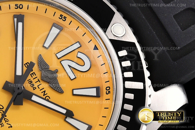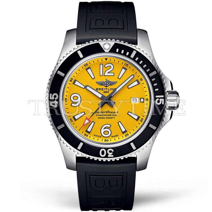 Часы Breitling из коллекции Superocean. Классические мужские часы Breitling Superocean Automatic 44 A17367021I1S1 премиального качества (Артикул магазина: BT-0471) оснащены надежным автоматическим механизмом с автоподзаводом (работает от амплитуды движения руки) калибра ETA2824-2, в котором реализованы следующие функции: часовая, минутная и секундная стрелки, а так же дата. Круглый корпус часов стального цвета, имеющий размер 44 мм и высоту 14.5 мм превосходно дополнит образ и украсит запястье своего обладателя. Для изготовления часов Breitling Superocean Automatic 44 A17367021I1S1 предлагаемых в нашем интернет-магазине, применяются нержавеющая сталь 316L высокого качества (Швейцарский стандарт), а так же сапфировое стекло высокой прочности, благодаря чему обеспечивается максимальная защита от сколов и механических повреждений. Отличительной чертой данной модели является желтый циферблат, часовые индексы которого обеспечивают часовые метки. Завершает образ каучуковый ремешок черного цвета с фирменной классической застежкой Breitling. Водонепроницаемость данной модели составляет 30М (WR30) – допускается минимальное воздействие с водой.