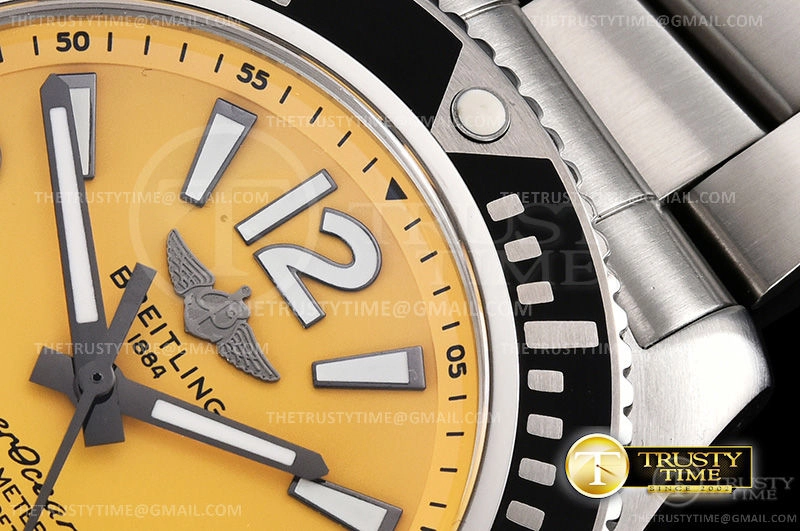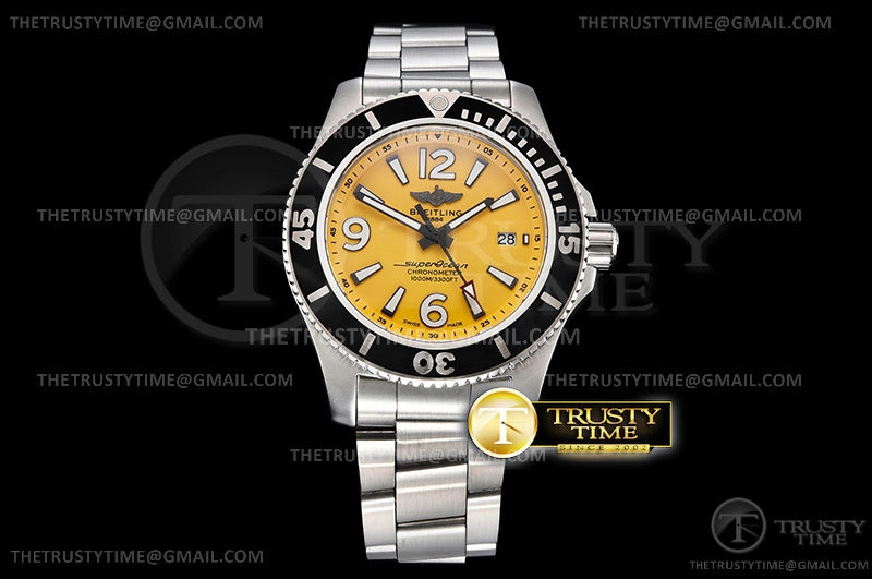 Часы Breitling из коллекции Superocean. Классические мужские часы Breitling Superocean Automatic 44 A17367021I1A1 премиального качества (Артикул магазина: BT-0478) оснащены надежным автоматическим механизмом с автоподзаводом (работает от амплитуды движения руки) калибра ETA2824-2, в котором реализованы следующие функции: часовая, минутная и секундная стрелки, а так же дата. Круглый корпус часов стального цвета, имеющий размер 44 мм и высоту 14.5 мм превосходно дополнит образ и украсит запястье своего обладателя. Для изготовления часов Breitling Superocean Automatic 44 A17367021I1A1 предлагаемых в нашем интернет-магазине, применяются нержавеющая сталь 316L высокого качества (Швейцарский стандарт), а так же сапфировое стекло высокой прочности, благодаря чему обеспечивается максимальная защита от сколов и механических повреждений. Отличительной чертой данной модели является желтый циферблат, часовые индексы которого обеспечивают часовые метки. Завершает образ браслет из нержавеющей стали стального цвета с фирменной раскладывающейся застежкой Breitling. Водонепроницаемость данной модели составляет 30М (WR30) – допускается минимальное воздействие с водой.