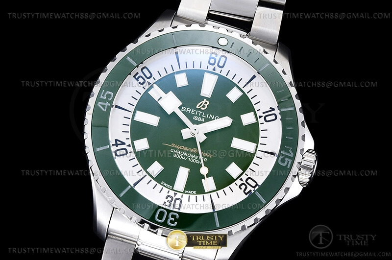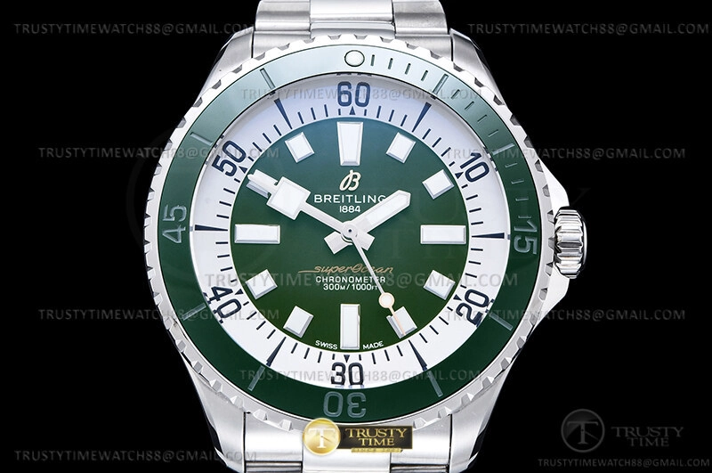 Часы Breitling из коллекции Superocean. Спортивные мужские часы Breitling Superocean Automatic 44mm A17376A31L1A1 премиального качества (Артикул магазина: BT-1053) оснащены надежным автоматическим механизмом с автоподзаводом (работает от амплитуды движения руки) калибра ETA2824-2, в котором реализованы следующие функции: часовая, минутная и секундная стрелки, а так же максимально простой функционал без усложнений. Круглый корпус часов стального цвета, имеющий размер 44 мм и высоту 12.6 мм превосходно дополнит образ и украсит запястье своего обладателя. Для изготовления часов Breitling Superocean Automatic 44mm A17376A31L1A1 предлагаемых в нашем интернет-магазине, применяются нержавеющая сталь 316L высокого качества (Швейцарский стандарт), а так же сапфировое стекло высокой прочности, благодаря чему обеспечивается максимальная защита от сколов и механических повреждений. Отличительной чертой данной модели является зеленый циферблат, часовые индексы которого обеспечивают часовые метки. Завершает образ браслет из нержавеющей стали стального цвета с фирменной раскладывающейся застежкой Breitling. Водонепроницаемость данной модели составляет 30М (WR30) – допускается минимальное воздействие с водой.