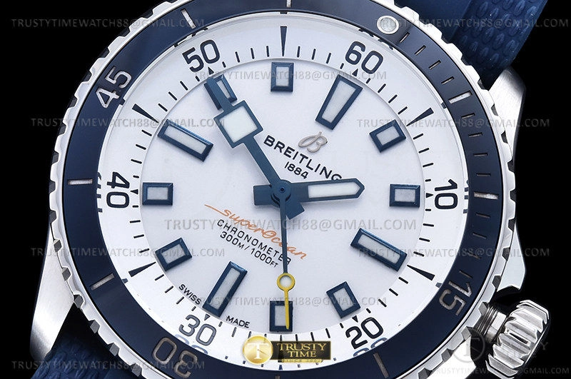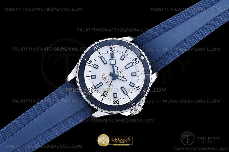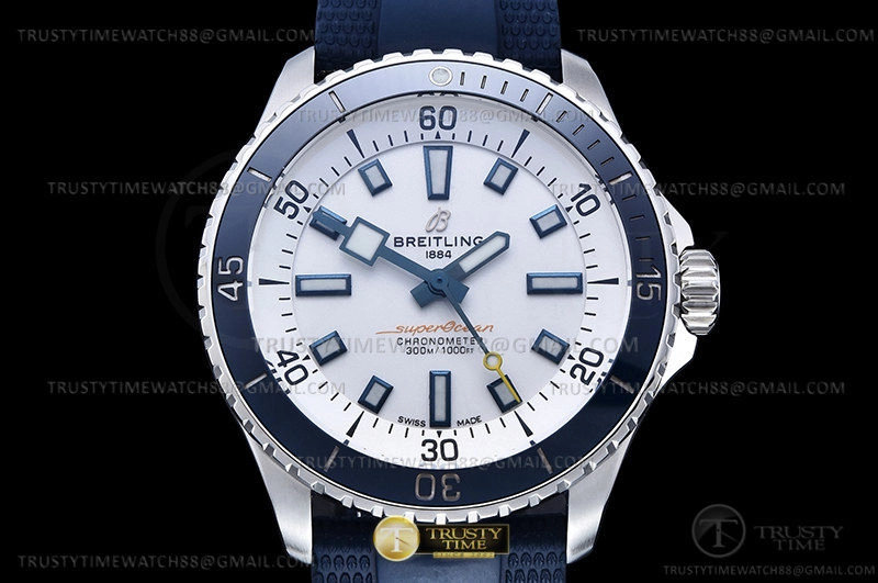 Часы Breitling из коллекции Superocean. Спортивные мужские часы Breitling Superocean Automatic 42mm A17375E71G1S1 премиального качества (Артикул магазина: BT-1060) оснащены надежным автоматическим механизмом с автоподзаводом (работает от амплитуды движения руки) калибра ETA2824-2, в котором реализованы следующие функции: часовая, минутная и секундная стрелки, а так же максимально простой функционал без усложнений. Круглый корпус часов стального цвета, имеющий размер 42 мм и высоту 13 мм превосходно дополнит образ и украсит запястье своего обладателя. Для изготовления часов Breitling Superocean Automatic 42mm A17375E71G1S1 предлагаемых в нашем интернет-магазине, применяются нержавеющая сталь 316L высокого качества (Швейцарский стандарт), а так же сапфировое стекло высокой прочности, благодаря чему обеспечивается максимальная защита от сколов и механических повреждений. Отличительной чертой данной модели является белый циферблат, часовые индексы которого обеспечивают часовые метки. Завершает образ каучуковый ремешок синего цвета с фирменной раскладывающейся застежкой Breitling. Водонепроницаемость данной модели составляет 30М (WR30) – допускается минимальное воздействие с водой.