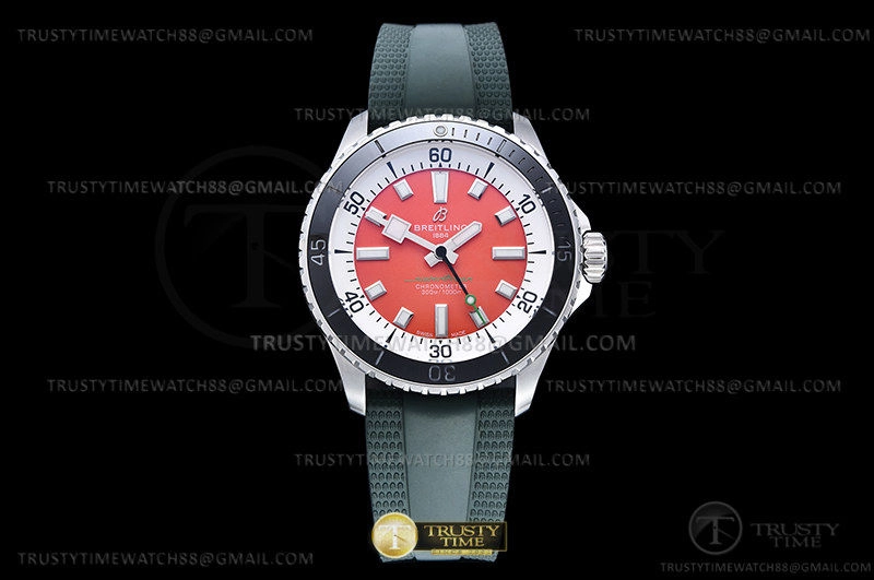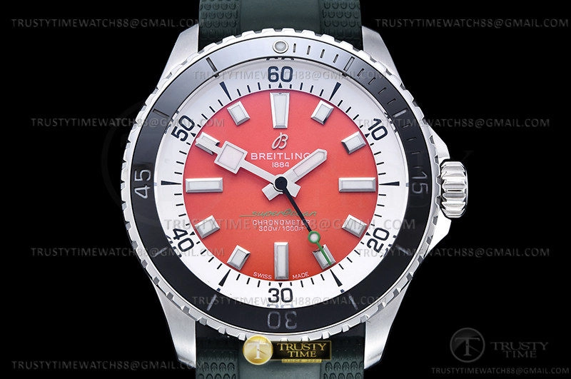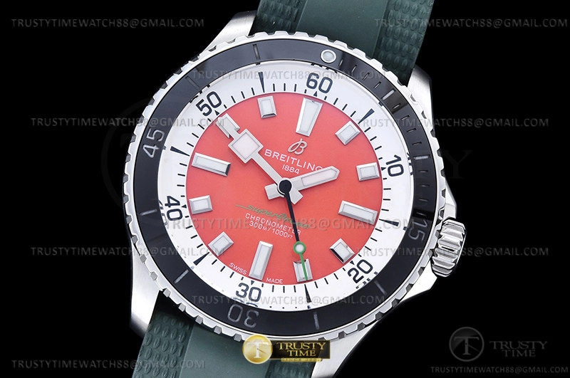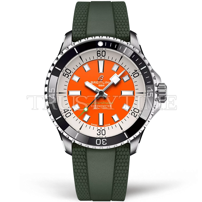 Часы Breitling из коллекции Superocean. Спортивные мужские часы Breitling Superocean Automatic 42mm Kelly Slater A173751A1O1S1 премиального качества (Артикул магазина: BT-1066) оснащены надежным автоматическим механизмом с автоподзаводом (работает от амплитуды движения руки) калибра ETA2824-2, в котором реализованы следующие функции: часовая, минутная и секундная стрелки, а так же максимально простой функционал без усложнений. Круглый корпус часов стального цвета, имеющий размер 42 мм и высоту 13 мм превосходно дополнит образ и украсит запястье своего обладателя. Для изготовления часов Breitling Superocean Automatic 42mm Kelly Slater A173751A1O1S1 предлагаемых в нашем интернет-магазине, применяются нержавеющая сталь 316L высокого качества (Швейцарский стандарт), а так же сапфировое стекло высокой прочности, благодаря чему обеспечивается максимальная защита от сколов и механических повреждений. Отличительной чертой данной модели является оранжевый циферблат, часовые индексы которого обеспечивают часовые метки. Завершает образ каучуковый ремешок зеленого цвета с фирменной раскладывающейся застежкой Breitling. Водонепроницаемость данной модели составляет 30М (WR30) – допускается минимальное воздействие с водой.