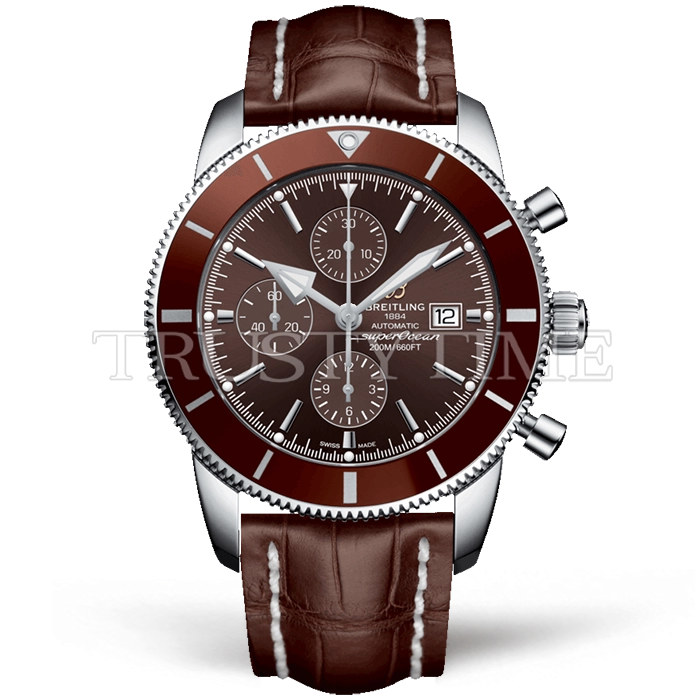 Часы Breitling из коллекции Superocean Heritage II Chronograph. Спортивные мужские часы Breitling Superocean Heritage Chronograph 46 A1331233/Q616/756P/A20BA.1 премиального качества (Артикул магазина: BT-0978) оснащены надежным автоматическим механизмом с автоподзаводом (работает от амплитуды движения руки) калибра Valjoux-7750, в котором реализованы следующие функции: часовая, минутная и секундная стрелки, а так же хронограф, дата. Круглый корпус часов стального цвета, имеющий размер 46 мм и высоту 16.4 мм превосходно дополнит образ и украсит запястье своего обладателя. Для изготовления часов Breitling Superocean Heritage Chronograph 46 A1331233/Q616/756P/A20BA.1 предлагаемых в нашем интернет-магазине, применяются нержавеющая сталь 316L высокого качества (Швейцарский стандарт), а так же сапфировое стекло высокой прочности, благодаря чему обеспечивается максимальная защита от сколов и механических повреждений. Отличительной чертой данной модели является коричневый циферблат, часовые индексы которого обеспечивают часовые метки. Завершает образ кожаный ремешок коричневого цвета с фирменной классической застежкой Breitling. Водонепроницаемость данной модели составляет 30М (WR30) – допускается минимальное воздействие с водой.