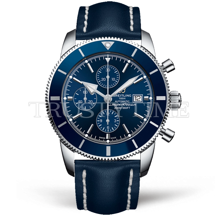Часы Breitling из коллекции Superocean Heritage II Chronograph. Спортивные мужские часы Breitling Superocean Heritage II Chronograph Gun 46 A1331216/C963/102X/A20D.1 премиального качества (Артикул магазина: BT-1000) оснащены надежным автоматическим механизмом с автоподзаводом (работает от амплитуды движения руки) калибра Valjoux-7750, в котором реализованы следующие функции: часовая, минутная и секундная стрелки, а так же хронограф, дата. Круглый корпус часов стального цвета, имеющий размер 46 мм и высоту 17 мм превосходно дополнит образ и украсит запястье своего обладателя. Для изготовления часов Breitling Superocean Heritage II Chronograph Gun 46 A1331216/C963/102X/A20D.1 предлагаемых в нашем интернет-магазине, применяются нержавеющая сталь 316F высокого качества (Швейцарский стандарт), а так же сапфировое стекло высокой прочности, благодаря чему обеспечивается максимальная защита от сколов и механических повреждений. Отличительной чертой данной модели является синий циферблат, часовые индексы которого обеспечивают часовые метки. Завершает образ кожаный ремешок синего цвета с фирменной раскладывающейся застежкой Breitling. Водонепроницаемость данной модели составляет 30М (WR30) – допускается минимальное воздействие с водой.