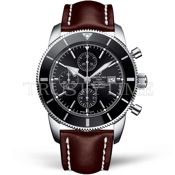 Часы Breitling из коллекции Superocean Heritage II Chronograph. Спортивные мужские часы Breitling Superocean Heritage II Chronograph Volcano 46 A1331212/BF78/443X/A20BA.1 премиального качества (Артикул магазина: BT-1013) оснащены надежным автоматическим механизмом с автоподзаводом (работает от амплитуды движения руки) калибра Valjoux-7750, в котором реализованы следующие функции: часовая, минутная и секундная стрелки, а так же хронограф, дата. Круглый корпус часов стального цвета, имеющий размер 46 мм и высоту 17 мм превосходно дополнит образ и украсит запястье своего обладателя. Для изготовления часов Breitling Superocean Heritage II Chronograph Volcano 46 A1331212/BF78/443X/A20BA.1 предлагаемых в нашем интернет-магазине, применяются нержавеющая сталь 316F высокого качества (Швейцарский стандарт), а так же сапфировое стекло высокой прочности, благодаря чему обеспечивается максимальная защита от сколов и механических повреждений. Отличительной чертой данной модели является черный циферблат, часовые индексы которого обеспечивают часовые метки. Завершает образ кожаный ремешок коричневого цвета с фирменной классической застежкой Breitling. Водонепроницаемость данной модели составляет 30М (WR30) – допускается минимальное воздействие с водой.