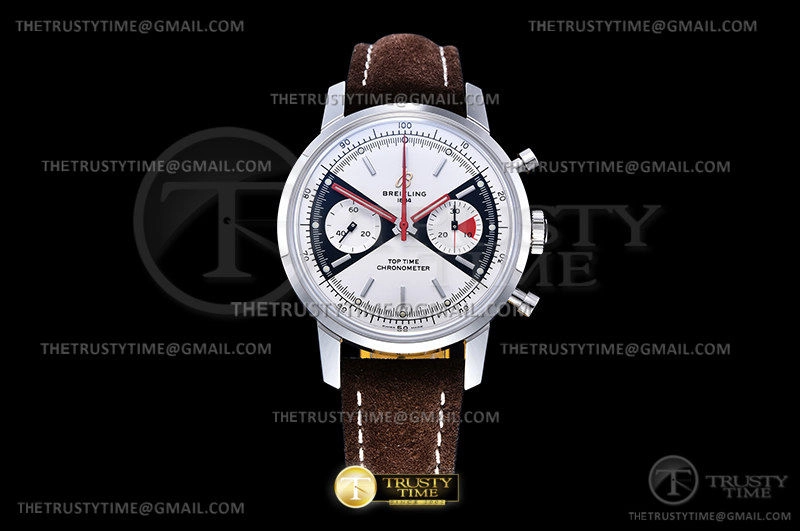Часы Breitling из коллекции Top Time. Спортивные мужские часы Breitling Top Time Chronograph 41 A23310121G1X1 премиального качества (Артикул магазина: BT-0565) оснащены надежным автоматическим механизмом с автоподзаводом (работает от амплитуды движения руки) калибра Valjoux-7750, в котором реализованы следующие функции: часовая, минутная и секундная стрелки, а так же хронограф. Круглый корпус часов стального цвета, имеющий размер 41 мм и высоту 17 мм превосходно дополнит образ и украсит запястье своего обладателя. Для изготовления часов Breitling Top Time Chronograph 41 A23310121G1X1 предлагаемых в нашем интернет-магазине, применяются нержавеющая сталь 316F высокого качества (Швейцарский стандарт), а так же сапфировое стекло высокой прочности, благодаря чему обеспечивается максимальная защита от сколов и механических повреждений. Отличительной чертой данной модели является белый циферблат, часовые индексы которого обеспечивают часовые метки. Завершает образ кожаный ремешок коричневого цвета с фирменной классической застежкой Breitling. Водонепроницаемость данной модели составляет 30М (WR30) – допускается минимальное воздействие с водой.