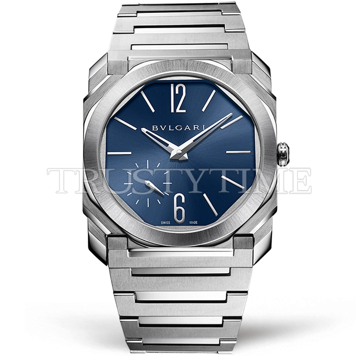 Часы Bvlgari из коллекции Octo Finissimo. Классические мужские часы Bvlgari Octo Finissimo 103431 премиального качества (Артикул магазина: BV-0719) оснащены надежным автоматическим механизмом с автоподзаводом (работает от амплитуды движения руки) калибра BVL138, в котором реализованы следующие функции: часовая, минутная и секундная стрелки, а так же максимально простой функционал без усложнений. Восьмиугольный корпус часов стального цвета, имеющий размер 40 мм и высоту 9.2 мм превосходно дополнит образ и украсит запястье своего обладателя. Для изготовления часов Bvlgari Octo Finissimo 103431 предлагаемых в нашем интернет-магазине, применяются нержавеющая сталь 316L высокого качества (Швейцарский стандарт), а так же сапфировое стекло высокой прочности, благодаря чему обеспечивается максимальная защита от сколов и механических повреждений. Отличительной чертой данной модели является синий циферблат, часовые индексы которого обеспечивают часовые метки. Завершает образ браслет из нержавеющей стали стального цвета с фирменной раскладывающейся застежкой Bvlgari. Водонепроницаемость данной модели составляет 30М (WR30) – допускается минимальное воздействие с водой.