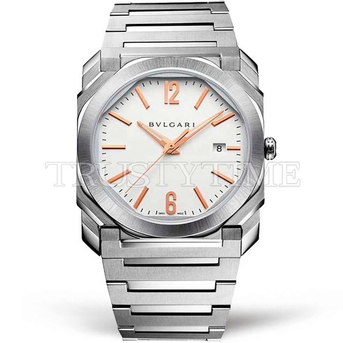 Часы Bvlgari из коллекции Octo Finissimo. Классические мужские часы Bvlgari Octo Finissimo Automatic премиального качества (Артикул магазина: BV-0722) оснащены надежным автоматическим механизмом с автоподзаводом (работает от амплитуды движения руки) калибра MY9015, в котором реализованы следующие функции: часовая, минутная и секундная стрелки, а так же дата. Восьмиугольный корпус часов стального цвета, имеющий размер 38 мм и высоту 11 мм превосходно дополнит образ и украсит запястье своего обладателя. Для изготовления часов Bvlgari Octo Finissimo Automatic предлагаемых в нашем интернет-магазине, применяются нержавеющая сталь 316L высокого качества (Швейцарский стандарт), а так же сапфировое стекло высокой прочности, благодаря чему обеспечивается максимальная защита от сколов и механических повреждений. Отличительной чертой данной модели является белый циферблат, часовые индексы которого обеспечивают часовые метки. Завершает образ браслет из нержавеющей стали стального цвета с фирменной раскладывающейся застежкой Bvlgari. Водонепроницаемость данной модели составляет 30М (WR30) – допускается минимальное воздействие с водой.