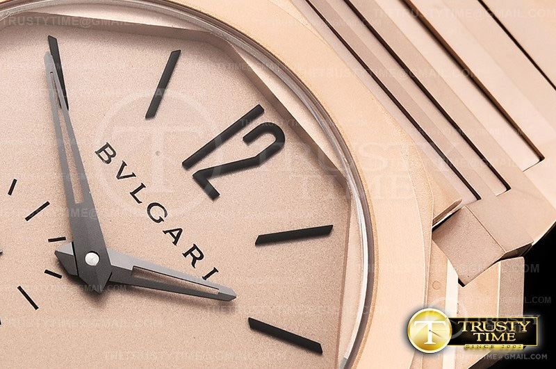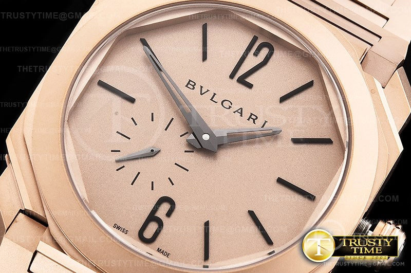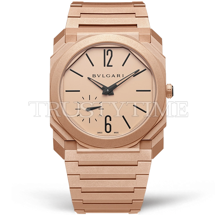 Часы Bvlgari из коллекции Octo Finissimo. Классические мужские часы Bvlgari Octo Finissimo 102912 премиального качества (Артикул магазина: BV-0690) оснащены надежным автоматическим механизмом с автоподзаводом (работает от амплитуды движения руки) калибра BVL138, в котором реализованы следующие функции: часовая, минутная и секундная стрелки, а так же максимально простой функционал без усложнений. Восьмиугольный корпус часов розового цвета, имеющий размер 40 мм и высоту 9.2 мм превосходно дополнит образ и украсит запястье своего обладателя. Для изготовления часов Bvlgari Octo Finissimo 102912 предлагаемых в нашем интернет-магазине, применяются нержавеющая сталь 316L высокого качества (Швейцарский стандарт), а так же сапфировое стекло высокой прочности, благодаря чему обеспечивается максимальная защита от сколов и механических повреждений. Отличительной чертой данной модели является золотой циферблат, часовые индексы которого обеспечивают часовые метки. Завершает образ браслет из нержавеющей стали цвета розового золота с фирменной раскладывающейся застежкой Bvlgari. Водонепроницаемость данной модели составляет 30М (WR30) – допускается минимальное воздействие с водой.