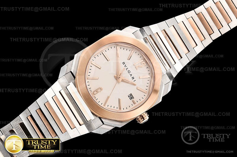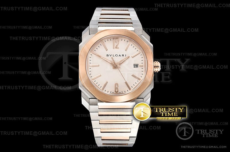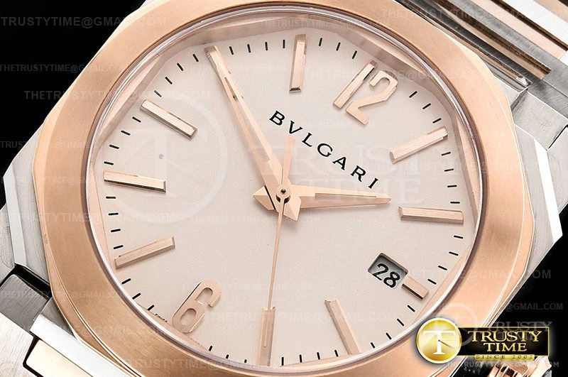 Часы Bvlgari из коллекции Octo Finissimo. Классические мужские часы Bvlgari Octo Finissimo Automatic премиального качества (Артикул магазина: BV-0679) оснащены надежным автоматическим механизмом с автоподзаводом (работает от амплитуды движения руки) калибра MY9015, в котором реализованы следующие функции: часовая, минутная и секундная стрелки, а так же дата. Восьмиугольный корпус часов комбинированного сталь с розового золота цвета, имеющий размер 38 мм и высоту 11 мм превосходно дополнит образ и украсит запястье своего обладателя. Для изготовления часов Bvlgari Octo Finissimo Automatic предлагаемых в нашем интернет-магазине, применяются нержавеющая сталь 316L высокого качества (Швейцарский стандарт), а так же сапфировое стекло высокой прочности, благодаря чему обеспечивается максимальная защита от сколов и механических повреждений. Отличительной чертой данной модели является белый циферблат, часовые индексы которого обеспечивают часовые метки. Завершает образ браслет из нержавеющей стали комбинированного сталь с розовым золотом цвета с фирменной раскладывающейся застежкой Bvlgari. Водонепроницаемость данной модели составляет 30М (WR30) – допускается минимальное воздействие с водой.