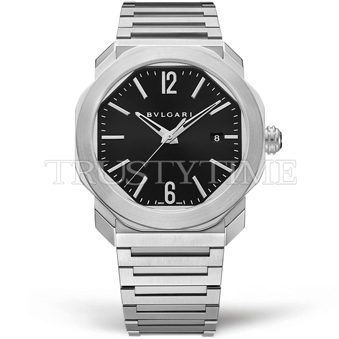 Часы Bvlgari из коллекции Octo Roma. Классические мужские часы Bvlgari Octo Roma 102704 премиального качества (Артикул магазина: BV-0684) оснащены надежным автоматическим механизмом с автоподзаводом (работает от амплитуды движения руки) калибра MY9015, в котором реализованы следующие функции: часовая, минутная и секундная стрелки, а так же дата. Восьмиугольный корпус часов стального цвета, имеющий размер 41 мм и высоту 11 мм превосходно дополнит образ и украсит запястье своего обладателя. Для изготовления часов Bvlgari Octo Roma 102704 предлагаемых в нашем интернет-магазине, применяются нержавеющая сталь 316L высокого качества (Швейцарский стандарт), а так же сапфировое стекло высокой прочности, благодаря чему обеспечивается максимальная защита от сколов и механических повреждений. Отличительной чертой данной модели является черный циферблат, часовые индексы которого обеспечивают часовые метки. Завершает образ браслет из нержавеющей стали стального цвета с фирменной раскладывающейся застежкой Bvlgari. Водонепроницаемость данной модели составляет 30М (WR30) – допускается минимальное воздействие с водой.