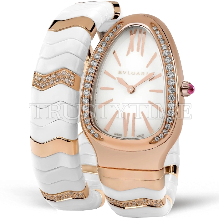 Часы Bvlgari из коллекции Serpenti. Классические женские часы Bvlgari Serpenti Spiga 102202 премиального качества (Артикул магазина: BV-0765) оснащены надежным кварцевым механизмом (работает от батареи) калибра Swiss Ronda Quartz, в котором реализованы следующие функции: часова и минутка стрелки, а так же максимально простой функционал без усложнений. Овальный корпус часов розового цвета, имеющий размер 26 мм и высоту превосходно дополнит образ и украсит запястье своего обладателя. Для изготовления часов Bvlgari Serpenti Spiga 102202 предлагаемых в нашем интернет-магазине, применяются нержавеющая сталь 316F высокого качества (Швейцарский стандарт), а так же сапфировое стекло высокой прочности, благодаря чему обеспечивается максимальная защита от сколов и механических повреждений. Отличительной чертой данной модели является белый циферблат, часовые индексы которого обеспечивают камни, часовые индексы которого обеспечивают часовые метки, часовые индексы которого обеспечивают римские цифры. Завершает образ керамический браслет белого цвета без застежки Bvlgari. Водонепроницаемость данной модели составляет 30М (WR30) – допускается минимальное воздействие с водой.
