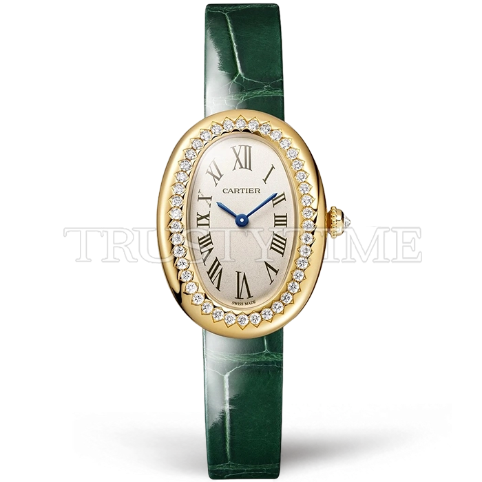 Часы Cartier из коллекции Baignoire. Классические женские часы Cartier Baignoire Watch WJBA0038 премиального качества (Артикул магазина: CR-0959) оснащены надежным кварцевым механизмом (работает от батареи) калибра Swiss Quartz ETA, в котором реализованы следующие функции: часова и минутка стрелки, а так же максимально простой функционал без усложнений. Овальный корпус часов цветы желтой золота, имеющий размер 31,4 мм х 23,09 мм и высоту 7 мм превосходно дополнит образ и украсит запястье своего обладателя. Для изготовления часов Cartier Baignoire Watch WJBA0038 предлагаемых в нашем интернет-магазине, применяются нержавеющая сталь 316F высокого качества (Швейцарский стандарт), а так же сапфировое стекло высокой прочности, благодаря чему обеспечивается максимальная защита от сколов и механических повреждений. Отличительной чертой данной модели является белый циферблат, часовые индексы которого обеспечивают римские цифры. Завершает образ кожаный ремешок зеленого цвета с фирменной классической застежкой Cartier. Водонепроницаемость данной модели составляет 30М (WR30) – допускается минимальное воздействие с водой.