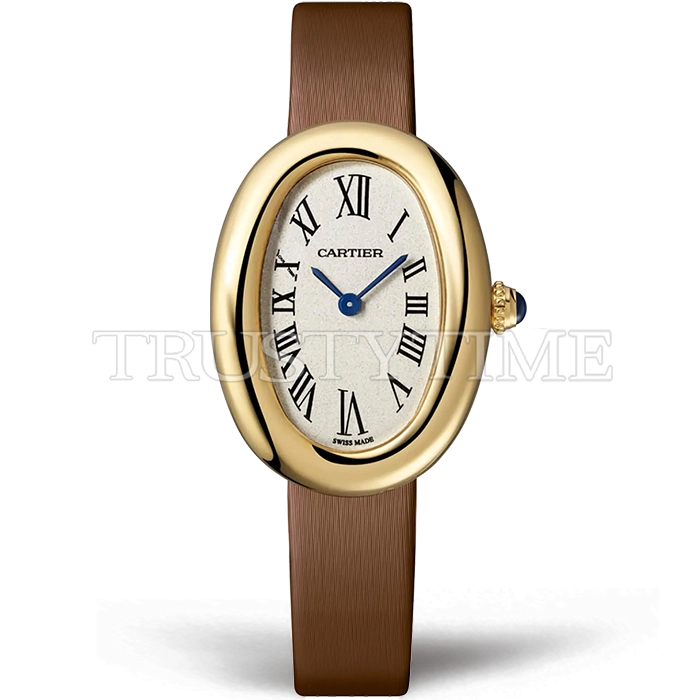 Часы Cartier из коллекции Baignoire. Классические женские часы Cartier Baignoire Watch WGBA0015 премиального качества (Артикул магазина: CR-0967) оснащены надежным кварцевым механизмом (работает от батареи) калибра Swiss Quartz ETA, в котором реализованы следующие функции: часова и минутка стрелки, а так же максимально простой функционал без усложнений. Овальный корпус часов цветы желтой золота, имеющий размер 32 мм х 26 мм и высоту 8 мм превосходно дополнит образ и украсит запястье своего обладателя. Для изготовления часов Cartier Baignoire Watch WGBA0015 предлагаемых в нашем интернет-магазине, применяются нержавеющая сталь 316F высокого качества (Швейцарский стандарт), а так же сапфировое стекло высокой прочности, благодаря чему обеспечивается максимальная защита от сколов и механических повреждений. Отличительной чертой данной модели является белый циферблат, часовые индексы которого обеспечивают римские цифры. Завершает образ сатиновый ремешок коричневого цвета с фирменной классической застежкой Cartier. Водонепроницаемость данной модели составляет 30М (WR30) – допускается минимальное воздействие с водой.