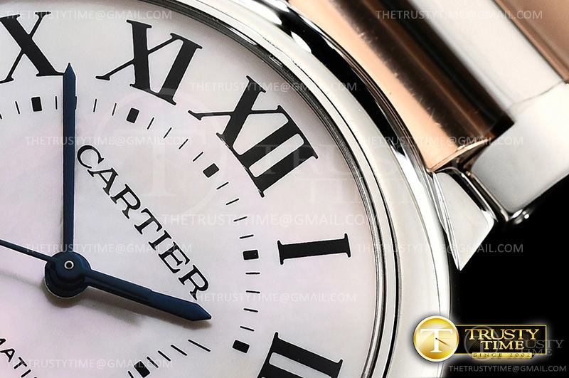 Часы Cartier из коллекции Ballon Bleu De Cartier. Классические женские часы Cartier Ballon Bleu 36 W6920033 премиального качества (Артикул магазина: CR-0500) оснащены надежным автоматическим механизмом с автоподзаводом (работает от амплитуды движения руки) калибра Seiko NH05A, в котором реализованы следующие функции: часовая, минутная и секундная стрелки, а так же максимально простой функционал без усложнений. Круглый корпус часов комбинированного сталь с розового золота цвета, имеющий размер 36 мм и высоту 12 мм превосходно дополнит образ и украсит запястье своего обладателя. Для изготовления часов Cartier Ballon Bleu 36 W6920033 предлагаемых в нашем интернет-магазине, применяются нержавеющая сталь 316F высокого качества (Швейцарский стандарт), а так же сапфировое стекло высокой прочности, благодаря чему обеспечивается максимальная защита от сколов и механических повреждений. Отличительной чертой данной модели является розовый циферблат, часовые индексы которого обеспечивают римские цифры. Завершает образ браслет из нержавеющей стали комбинированного сталь с розовым золотом цвета с фирменной раскладывающейся застежкой Cartier. Водонепроницаемость данной модели составляет 30М (WR30) – допускается минимальное воздействие с водой.