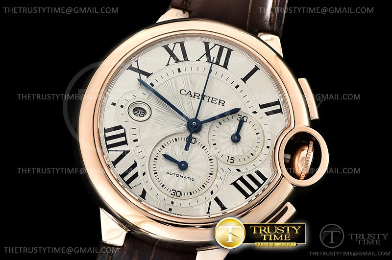 Часы Cartier из коллекции Ballon Bleu Chronograph. Спортивные мужские часы Cartier Balon Bleu Chronograph 44 W6920009 премиального качества (Артикул магазина: CR-0478) оснащены надежным автоматическим механизмом с автоподзаводом (работает от амплитуды движения руки) калибра Valjoux-7750, в котором реализованы следующие функции: часовая, минутная и секундная стрелки, а так же хронограф, дата. Круглый корпус часов розового цвета, имеющий размер 44 мм и высоту 14.8 мм превосходно дополнит образ и украсит запястье своего обладателя. Для изготовления часов Cartier Balon Bleu Chronograph 44 W6920009 предлагаемых в нашем интернет-магазине, применяются нержавеющая сталь 316F высокого качества (Швейцарский стандарт), а так же сапфировое стекло высокой прочности, благодаря чему обеспечивается максимальная защита от сколов и механических повреждений. Отличительной чертой данной модели является серебристый циферблат, часовые индексы которого обеспечивают римские цифры. Завершает образ кожаный ремешок коричневого цвета с фирменной раскладывающейся застежкой Cartier. Водонепроницаемость данной модели составляет 30М (WR30) – допускается минимальное воздействие с водой.