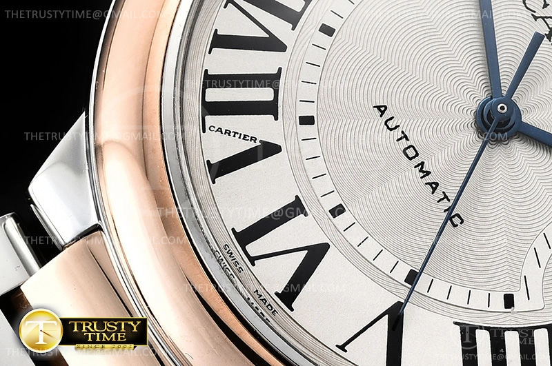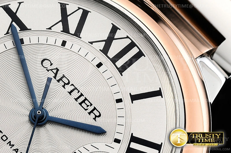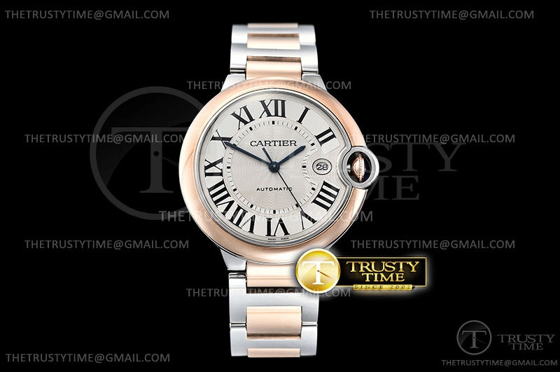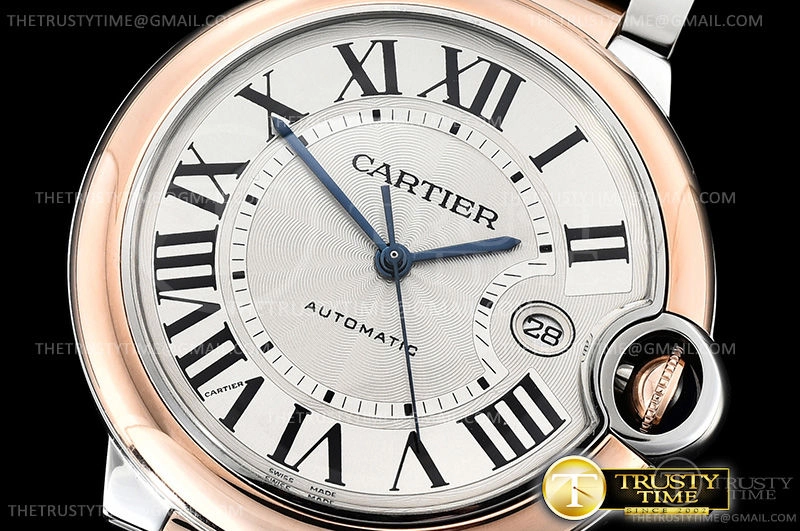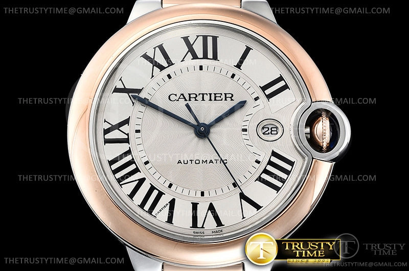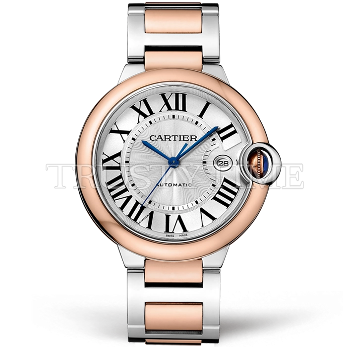 Часы Cartier из коллекции Ballon Bleu De Cartier. Классические мужские часы Cartier Ballon Bleu 42 W2BB0004 премиального качества (Артикул магазина: CR-0491) оснащены надежным автоматическим механизмом с автоподзаводом (работает от амплитуды движения руки) калибра ETA2824-2, в котором реализованы следующие функции: часовая, минутная и секундная стрелки, а так же дата. Круглый корпус часов комбинированного сталь с розового золота цвета, имеющий размер 42 мм и высоту 13 мм превосходно дополнит образ и украсит запястье своего обладателя. Для изготовления часов Cartier Ballon Bleu 42 W2BB0004 предлагаемых в нашем интернет-магазине, применяются нержавеющая сталь 316F высокого качества (Швейцарский стандарт), а так же сапфировое стекло высокой прочности, благодаря чему обеспечивается максимальная защита от сколов и механических повреждений. Отличительной чертой данной модели является серебристый циферблат, часовые индексы которого обеспечивают римские цифры. Завершает образ браслет из нержавеющей стали комбинированного сталь с розовым золотом цвета с фирменной раскладывающейся застежкой Cartier. Водонепроницаемость данной модели составляет 30М (WR30) – допускается минимальное воздействие с водой.