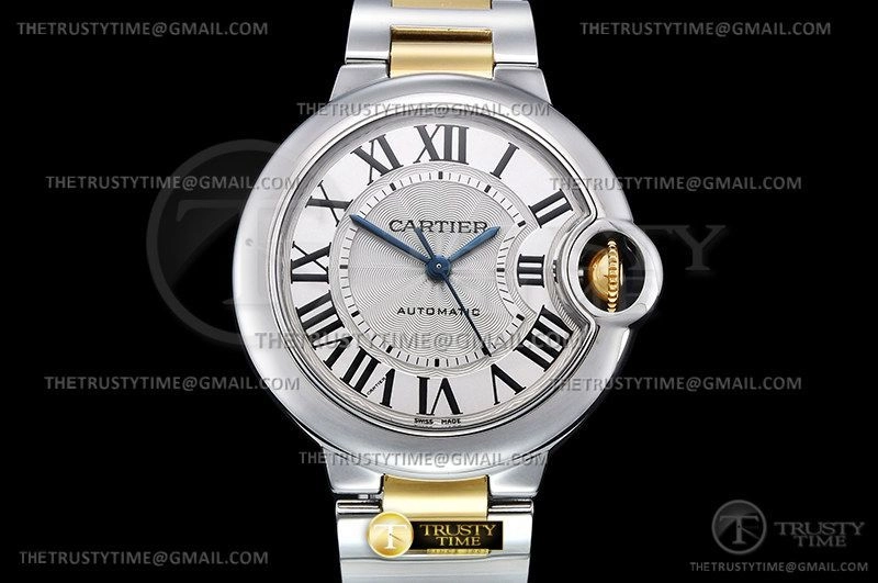 Часы Cartier из коллекции Ballon Bleu De Cartier. Классические женские часы Cartier Ballon Bleu 33 W2BB0002 премиального качества (Артикул магазина: CR-0766) оснащены надежным автоматическим механизмом с автоподзаводом (работает от амплитуды движения руки) калибра 076, в котором реализованы следующие функции: часовая, минутная и секундная стрелки, а так же максимально простой функционал без усложнений. Круглый корпус часов комбинированного сталь с желтого золота цвета, имеющий размер 33 мм и высоту 10 мм превосходно дополнит образ и украсит запястье своего обладателя. Для изготовления часов Cartier Ballon Bleu 33 W2BB0002 предлагаемых в нашем интернет-магазине, применяются нержавеющая сталь 316F высокого качества (Швейцарский стандарт), а так же сапфировое стекло высокой прочности, благодаря чему обеспечивается максимальная защита от сколов и механических повреждений. Отличительной чертой данной модели является серебристый циферблат, часовые индексы которого обеспечивают римские цифры. Завершает образ браслет из нержавеющей стали комбинированного сталь с желтым золотом цвета с фирменной раскладывающейся застежкой Cartier. Водонепроницаемость данной модели составляет 30М (WR30) – допускается минимальное воздействие с водой.