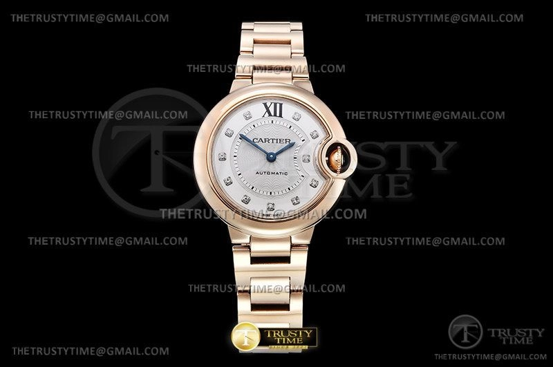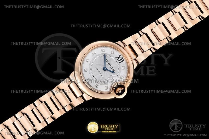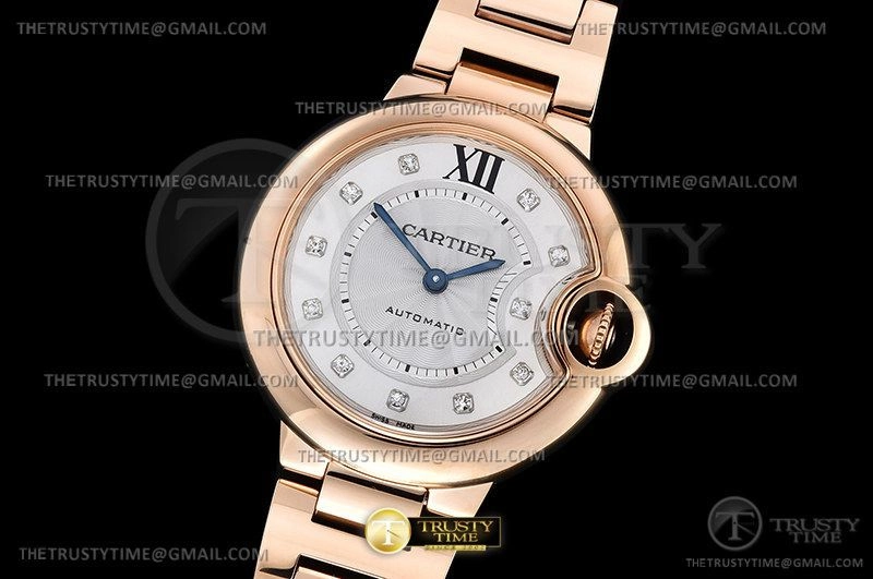 Часы Cartier из коллекции Ballon Bleu De Cartier. Классические женские часы Cartier Ballon Bleu 33 WE902039 премиального качества (Артикул магазина: CR-0769) оснащены надежным автоматическим механизмом с автоподзаводом (работает от амплитуды движения руки) калибра 076, в котором реализованы следующие функции: часовая, минутная и секундная стрелки, а так же максимально простой функционал без усложнений. Круглый корпус часов розового цвета, имеющий размер 33 мм и высоту 10 мм превосходно дополнит образ и украсит запястье своего обладателя. Для изготовления часов Cartier Ballon Bleu 33 WE902039 предлагаемых в нашем интернет-магазине, применяются нержавеющая сталь 316F высокого качества (Швейцарский стандарт), а так же сапфировое стекло высокой прочности, благодаря чему обеспечивается максимальная защита от сколов и механических повреждений. Отличительной чертой данной модели является серебристый циферблат, часовые индексы которого обеспечивают камни. Завершает образ браслет из нержавеющей стали цвета розового золота с фирменной раскладывающейся застежкой Cartier. Водонепроницаемость данной модели составляет 30М (WR30) – допускается минимальное воздействие с водой.