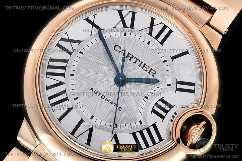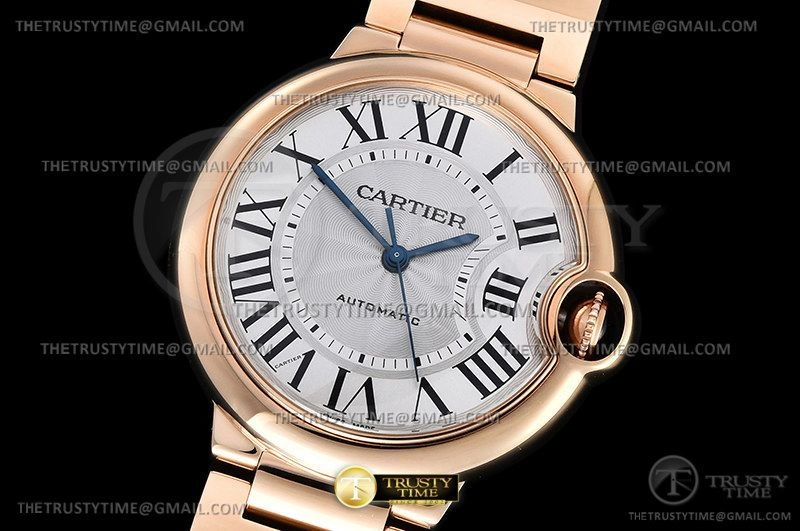 Часы Cartier из коллекции Ballon Bleu De Cartier. Классические женские часы Cartier Ballon Bleu 36 WGBB0008 премиального качества (Артикул магазина: CR-0773) оснащены надежным автоматическим механизмом с автоподзаводом (работает от амплитуды движения руки) калибра 076, в котором реализованы следующие функции: часовая, минутная и секундная стрелки, а так же максимально простой функционал без усложнений. Круглый корпус часов розового цвета, имеющий размер 36 мм и высоту 12 мм превосходно дополнит образ и украсит запястье своего обладателя. Для изготовления часов Cartier Ballon Bleu 36 WGBB0008 предлагаемых в нашем интернет-магазине, применяются нержавеющая сталь 316F высокого качества (Швейцарский стандарт), а так же сапфировое стекло высокой прочности, благодаря чему обеспечивается максимальная защита от сколов и механических повреждений. Отличительной чертой данной модели является серебристый циферблат, часовые индексы которого обеспечивают римские цифры. Завершает образ браслет из нержавеющей стали цвета розового золота с фирменной раскладывающейся застежкой Cartier. Водонепроницаемость данной модели составляет 30М (WR30) – допускается минимальное воздействие с водой.