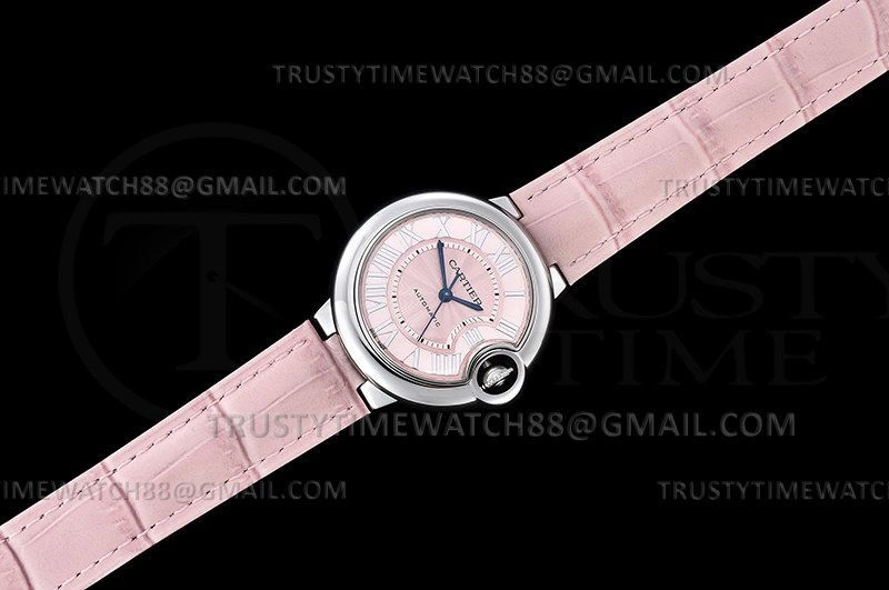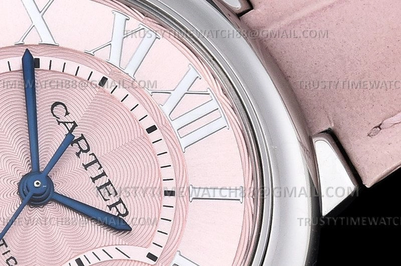 Часы Cartier из коллекции Ballon Bleu De Cartier. Классические женские часы Cartier Ballon Bleu 33 WSBB0002 премиального качества (Артикул магазина: CR-0786) оснащены надежным автоматическим механизмом с автоподзаводом (работает от амплитуды движения руки) калибра 076, в котором реализованы следующие функции: часовая, минутная и секундная стрелки, а так же максимально простой функционал без усложнений. Круглый корпус часов стального цвета, имеющий размер 33 мм и высоту 10 мм превосходно дополнит образ и украсит запястье своего обладателя. Для изготовления часов Cartier Ballon Bleu 33 WSBB0002 предлагаемых в нашем интернет-магазине, применяются нержавеющая сталь 316F высокого качества (Швейцарский стандарт), а так же сапфировое стекло высокой прочности, благодаря чему обеспечивается максимальная защита от сколов и механических повреждений. Отличительной чертой данной модели является розовый циферблат, часовые индексы которого обеспечивают римские цифры. Завершает образ кожаный ремешок розового цвета с фирменной раскладывающейся застежкой Cartier. Водонепроницаемость данной модели составляет 30М (WR30) – допускается минимальное воздействие с водой.