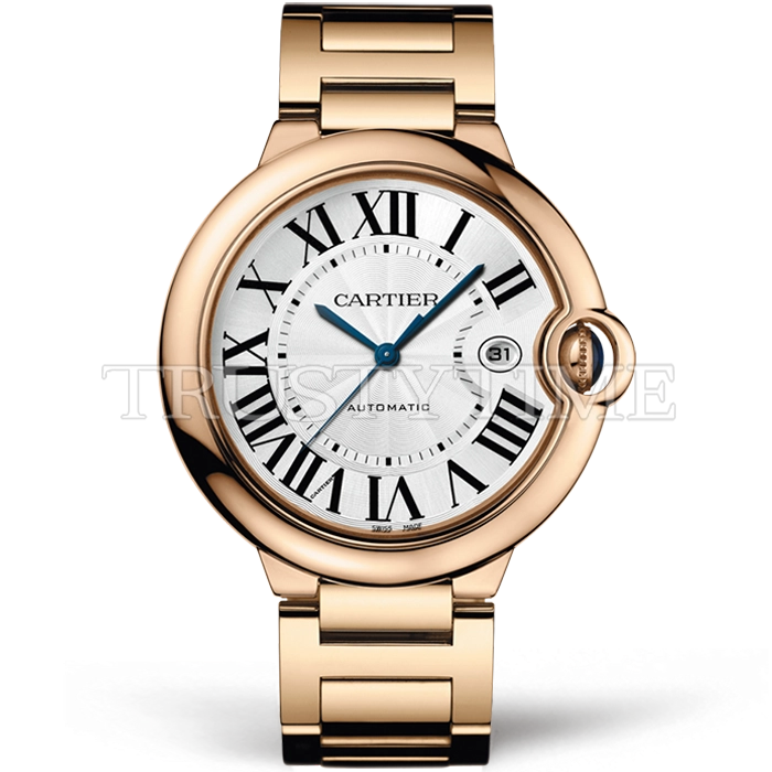 Часы Cartier из коллекции Ballon Bleu De Cartier. Классические мужские часы Cartier Ballon Bleu 42 WGBB0016 премиального качества (Артикул магазина: CR-0426) оснащены надежным автоматическим механизмом с автоподзаводом (работает от амплитуды движения руки) калибра Seiko NH05A, в котором реализованы следующие функции: часовая, минутная и секундная стрелки, а так же дата. Круглый корпус часов розового цвета, имеющий размер 42 мм и высоту 13 мм превосходно дополнит образ и украсит запястье своего обладателя. Для изготовления часов Cartier Ballon Bleu 42 WGBB0016 предлагаемых в нашем интернет-магазине, применяются нержавеющая сталь 316L высокого качества (Швейцарский стандарт), а так же сапфировое стекло высокой прочности, благодаря чему обеспечивается максимальная защита от сколов и механических повреждений. Отличительной чертой данной модели является серебристый циферблат, часовые индексы которого обеспечивают римские цифры. Завершает образ браслет из нержавеющей стали цвета розового золота с фирменной раскладывающейся застежкой Cartier. Водонепроницаемость данной модели составляет 30М (WR30) – допускается минимальное воздействие с водой.