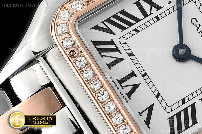 Часы Cartier из коллекции Panthere Secrete De Ladies. Классические женские часы Cartier Panthere Secrete De Ladies 27 W3PN0007 премиального качества (Артикул магазина: CR-0628) оснащены надежным кварцевым механизмом (работает от батареи) калибра Swiss Quartz ETA, в котором реализованы следующие функции: часова и минутка стрелки, а так же максимально простой функционал без усложнений. Квадратный корпус часов комбинированного сталь с розового золота цвета, имеющий размер 27 мм х 37 мм и высоту 6.5 мм превосходно дополнит образ и украсит запястье своего обладателя. Для изготовления часов Cartier Panthere Secrete De Ladies 27 W3PN0007 предлагаемых в нашем интернет-магазине, применяются нержавеющая сталь 316L высокого качества (Швейцарский стандарт), а так же сапфировое стекло высокой прочности, благодаря чему обеспечивается максимальная защита от сколов и механических повреждений. Отличительной чертой данной модели является белый циферблат, часовые индексы которого обеспечивают римские цифры. Завершает образ браслет из нержавеющей стали комбинированного сталь с розовым золотом цвета с фирменной раскладывающейся застежкой Cartier. Водонепроницаемость данной модели составляет 30М (WR30) – допускается минимальное воздействие с водой.