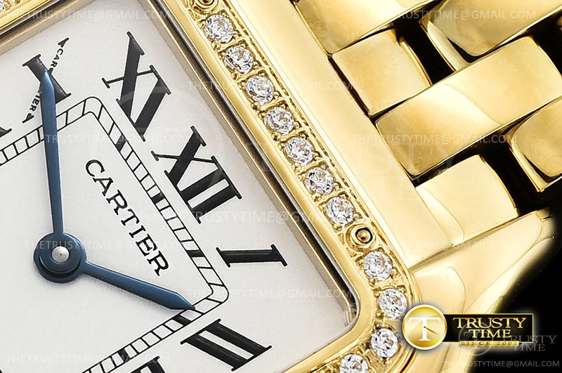Часы Cartier из коллекции Panthere Secrete De Ladies. Классические женские часы Cartier Panthere Secrete De Ladies 27 WJPN0016 премиального качества (Артикул магазина: CR-0633) оснащены надежным кварцевым механизмом (работает от батареи) калибра Swiss Quartz ETA, в котором реализованы следующие функции: часова и минутка стрелки, а так же максимально простой функционал без усложнений. Квадратный корпус часов цветы желтой золота, имеющий размер 27 мм х 37 мм и высоту 6.5 мм превосходно дополнит образ и украсит запястье своего обладателя. Для изготовления часов Cartier Panthere Secrete De Ladies 27 WJPN0016 предлагаемых в нашем интернет-магазине, применяются нержавеющая сталь 316L высокого качества (Швейцарский стандарт), а так же сапфировое стекло высокой прочности, благодаря чему обеспечивается максимальная защита от сколов и механических повреждений. Отличительной чертой данной модели является белый циферблат, часовые индексы которого обеспечивают римские цифры. Завершает образ браслет из нержавеющей стали цвета желтого золота с фирменной раскладывающейся застежкой Cartier. Водонепроницаемость данной модели составляет 30М (WR30) – допускается минимальное воздействие с водой.