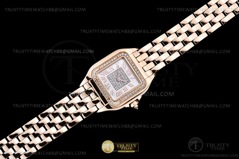 Часы Cartier из коллекции Panthere Secrete De Ladies. Классические женские часы Cartier La Panthere De Cartier Ladies 22 WJPN0039 премиального качества (Артикул магазина: CR-0977) оснащены надежным кварцевым механизмом (работает от батареи) калибра Swiss Quartz ETA, в котором реализованы следующие функции: часова и минутка стрелки, а так же максимально простой функционал без усложнений. Квадратный корпус часов розового цвета, имеющий размер 22 мм х 30 мм и высоту 6 мм превосходно дополнит образ и украсит запястье своего обладателя. Для изготовления часов Cartier La Panthere De Cartier Ladies 22 WJPN0039 предлагаемых в нашем интернет-магазине, применяются нержавеющая сталь 316L высокого качества (Швейцарский стандарт), а так же сапфировое стекло высокой прочности, благодаря чему обеспечивается максимальная защита от сколов и механических повреждений. Отличительной чертой данной модели является серебристый циферблат, часовые индексы которого обеспечивают римские цифры. Завершает образ браслет из нержавеющей стали цвета розового золота с фирменной раскладывающейся застежкой Cartier. Водонепроницаемость данной модели составляет 30М (WR30) – допускается минимальное воздействие с водой.