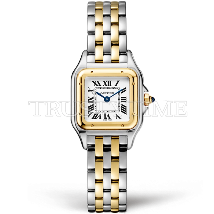 Часы Cartier из коллекции Panthere Secrete De Ladies. Классические женские часы Cartier Panthère Secrete Ladies 22 W2PN0006 премиального качества (Артикул магазина: CR-0468) оснащены надежным кварцевым механизмом (работает от батареи) калибра Swiss Quartz ETA, в котором реализованы следующие функции: часова и минутка стрелки, а так же максимально простой функционал без усложнений. Квадратный корпус часов комбинированного сталь с желтого золота цвета, имеющий размер 22 мм х 30 мм и высоту 6 мм превосходно дополнит образ и украсит запястье своего обладателя. Для изготовления часов Cartier Panthère Secrete Ladies 22 W2PN0006 предлагаемых в нашем интернет-магазине, применяются нержавеющая сталь 316F высокого качества (Швейцарский стандарт), а так же сапфировое стекло высокой прочности, благодаря чему обеспечивается максимальная защита от сколов и механических повреждений. Отличительной чертой данной модели является белый циферблат, часовые индексы которого обеспечивают римские цифры. Завершает образ браслет из нержавеющей стали комбинированного сталь с желтым золотом цвета с фирменной раскладывающейся застежкой Cartier. Водонепроницаемость данной модели составляет 30М (WR30) – допускается минимальное воздействие с водой.