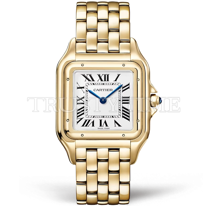 Часы Cartier из коллекции Panthere Secrete De Ladies. Классические женские часы Cartier La Panthere De Cartier Ladies 31 WGPN0051 премиального качества (Артикул магазина: CR-0984) оснащены надежным кварцевым механизмом (работает от батареи) калибра Swiss Quartz ETA, в котором реализованы следующие функции: часова и минутка стрелки, а так же максимально простой функционал без усложнений. Квадратный корпус часов цветы желтой золота, имеющий размер 42 мм x 31 мм и высоту 6.7 мм превосходно дополнит образ и украсит запястье своего обладателя. Для изготовления часов Cartier La Panthere De Cartier Ladies 31 WGPN0051 предлагаемых в нашем интернет-магазине, применяются нержавеющая сталь 316L высокого качества (Швейцарский стандарт), а так же сапфировое стекло высокой прочности, благодаря чему обеспечивается максимальная защита от сколов и механических повреждений. Отличительной чертой данной модели является белый циферблат, часовые индексы которого обеспечивают римские цифры. Завершает образ браслет из нержавеющей стали цвета желтого золота с фирменной раскладывающейся застежкой Cartier. Водонепроницаемость данной модели составляет 30М (WR30) – допускается минимальное воздействие с водой.