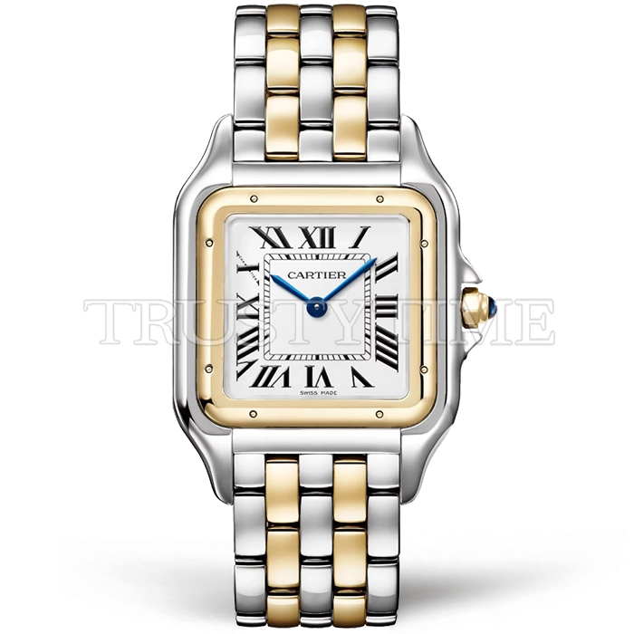 Часы Cartier из коллекции Panthere Secrete De Ladies. Классические женские часы Cartier La Panthere De Cartier Ladies 31 W2PN0016 премиального качества (Артикул магазина: CR-0985) оснащены надежным кварцевым механизмом (работает от батареи) калибра Swiss Quartz ETA, в котором реализованы следующие функции: часова и минутка стрелки, а так же максимально простой функционал без усложнений. Квадратный корпус часов комбинированного сталь с желтого золота цвета, имеющий размер 42 мм x 31 мм и высоту 6.7 мм превосходно дополнит образ и украсит запястье своего обладателя. Для изготовления часов Cartier La Panthere De Cartier Ladies 31 W2PN0016 предлагаемых в нашем интернет-магазине, применяются нержавеющая сталь 316L высокого качества (Швейцарский стандарт), а так же сапфировое стекло высокой прочности, благодаря чему обеспечивается максимальная защита от сколов и механических повреждений. Отличительной чертой данной модели является белый циферблат, часовые индексы которого обеспечивают римские цифры. Завершает образ браслет из нержавеющей стали комбинированного сталь с желтым золотом цвета с фирменной раскладывающейся застежкой Cartier. Водонепроницаемость данной модели составляет 30М (WR30) – допускается минимальное воздействие с водой.