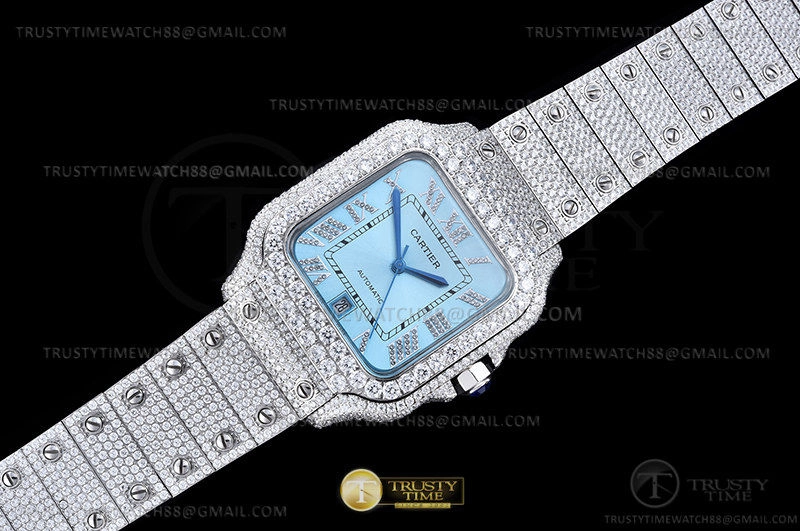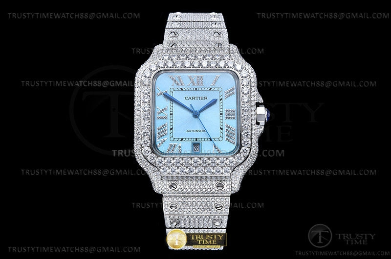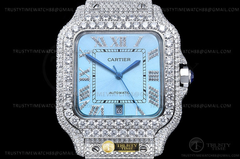 Часы Cartier из коллекции Santos De Cartier. Классические мужские часы Cartier Santos De Cartier 40 WSSA0018 Diamonds премиального качества (Артикул магазина: CR-0930) оснащены надежным автоматическим механизмом с автоподзаводом (работает от амплитуды движения руки) калибра MY8215, в котором реализованы следующие функции: часовая, минутная и секундная стрелки, а так же дата. Квадратный корпус часов стального цвета, имеющий размер 40 мм и высоту 12 мм превосходно дополнит образ и украсит запястье своего обладателя. Для изготовления часов Cartier Santos De Cartier 40 WSSA0018 Diamonds предлагаемых в нашем интернет-магазине, применяются нержавеющая сталь 316L высокого качества (Швейцарский стандарт), а так же сапфировое стекло высокой прочности, благодаря чему обеспечивается максимальная защита от сколов и механических повреждений. Отличительной чертой данной модели является голубой циферблат, часовые индексы которого обеспечивают римские цифры. Завершает образ браслет из нержавеющей стали стального цвета с фирменной раскладывающейся застежкой Cartier. Водонепроницаемость данной модели составляет 30М (WR30) – допускается минимальное воздействие с водой.