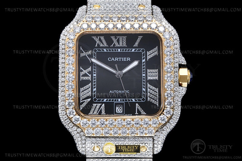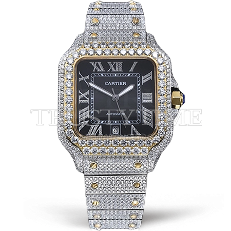 Часы Cartier из коллекции Santos De Cartier. Классические мужские часы Cartier Santos De Cartier 40 W2SA0009 Diamonds премиального качества (Артикул магазина: CR-0937) оснащены надежным автоматическим механизмом с автоподзаводом (работает от амплитуды движения руки) калибра MY8215, в котором реализованы следующие функции: часовая, минутная и секундная стрелки, а так же дата. Квадратный корпус часов комбинированного сталь с желтого золота цвета, имеющий размер 40 мм и высоту 12 мм превосходно дополнит образ и украсит запястье своего обладателя. Для изготовления часов Cartier Santos De Cartier 40 W2SA0009 Diamonds предлагаемых в нашем интернет-магазине, применяются нержавеющая сталь 316L высокого качества (Швейцарский стандарт), а так же сапфировое стекло высокой прочности, благодаря чему обеспечивается максимальная защита от сколов и механических повреждений. Отличительной чертой данной модели является черный циферблат, часовые индексы которого обеспечивают римские цифры. Завершает образ браслет из нержавеющей стали комбинированного сталь с желтым золотом цвета с фирменной раскладывающейся застежкой Cartier. Водонепроницаемость данной модели составляет 30М (WR30) – допускается минимальное воздействие с водой.