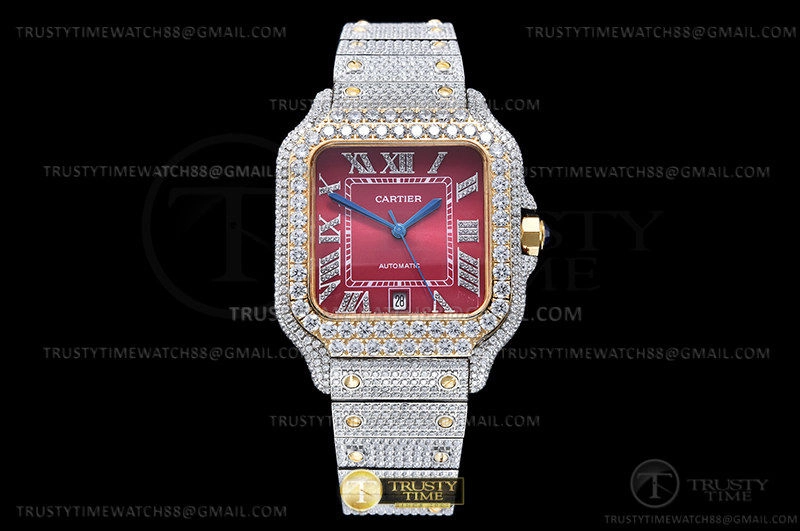 Часы Cartier из коллекции Santos De Cartier. Классические мужские часы Cartier Santos De Cartier 40 W2SA0009 Diamonds премиального качества (Артикул магазина: CR-0938) оснащены надежным автоматическим механизмом с автоподзаводом (работает от амплитуды движения руки) калибра MY8215, в котором реализованы следующие функции: часовая, минутная и секундная стрелки, а так же дата. Квадратный корпус часов комбинированного сталь с желтого золота цвета, имеющий размер 40 мм и высоту 12 мм превосходно дополнит образ и украсит запястье своего обладателя. Для изготовления часов Cartier Santos De Cartier 40 W2SA0009 Diamonds предлагаемых в нашем интернет-магазине, применяются нержавеющая сталь 316L высокого качества (Швейцарский стандарт), а так же сапфировое стекло высокой прочности, благодаря чему обеспечивается максимальная защита от сколов и механических повреждений. Отличительной чертой данной модели является красный циферблат, часовые индексы которого обеспечивают римские цифры. Завершает образ браслет из нержавеющей стали комбинированного сталь с желтым золотом цвета с фирменной раскладывающейся застежкой Cartier. Водонепроницаемость данной модели составляет 30М (WR30) – допускается минимальное воздействие с водой.