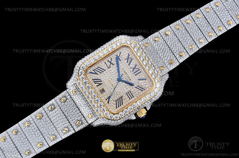 Часы Cartier из коллекции Santos De Cartier. Классические мужские часы Cartier Santos De Cartier 40 W2SA0009 Diamonds премиального качества (Артикул магазина: CR-0940) оснащены надежным автоматическим механизмом с автоподзаводом (работает от амплитуды движения руки) калибра MY8215, в котором реализованы следующие функции: часовая, минутная и секундная стрелки, а так же дата. Квадратный корпус часов комбинированного сталь с желтого золота цвета, имеющий размер 40 мм и высоту 12 мм превосходно дополнит образ и украсит запястье своего обладателя. Для изготовления часов Cartier Santos De Cartier 40 W2SA0009 Diamonds предлагаемых в нашем интернет-магазине, применяются нержавеющая сталь 316L высокого качества (Швейцарский стандарт), а так же сапфировое стекло высокой прочности, благодаря чему обеспечивается максимальная защита от сколов и механических повреждений. Отличительной чертой данной модели является золотой циферблат, часовые индексы которого обеспечивают римские цифры. Завершает образ браслет из нержавеющей стали комбинированного сталь с желтым золотом цвета с фирменной раскладывающейся застежкой Cartier. Водонепроницаемость данной модели составляет 30М (WR30) – допускается минимальное воздействие с водой.