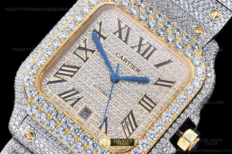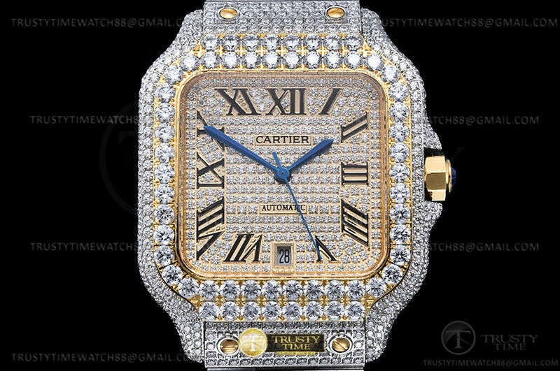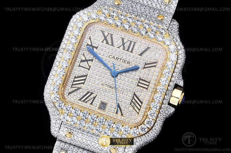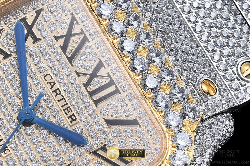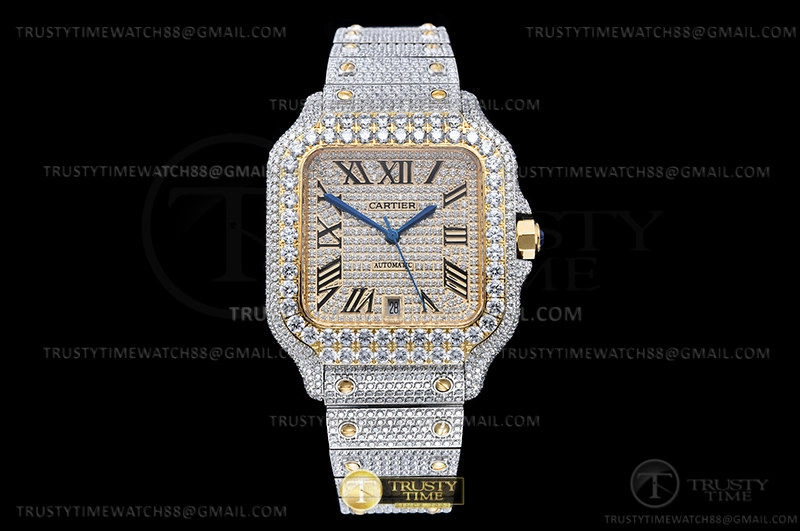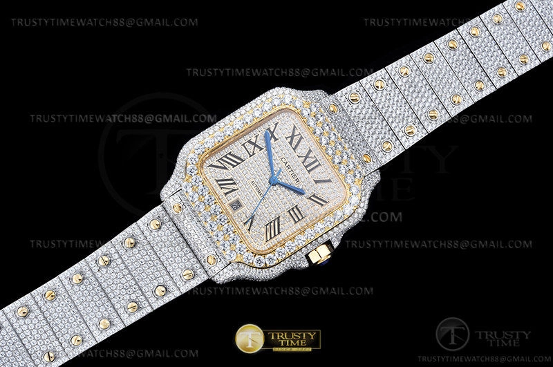Часы Cartier из коллекции Santos De Cartier. Классические мужские часы Cartier Santos De Cartier 40 W2SA0009 Diamonds премиального качества (Артикул магазина: CR-0941) оснащены надежным автоматическим механизмом с автоподзаводом (работает от амплитуды движения руки) калибра MY8215, в котором реализованы следующие функции: часовая, минутная и секундная стрелки, а так же дата. Квадратный корпус часов комбинированного сталь с желтого золота цвета, имеющий размер 40 мм и высоту 12 мм превосходно дополнит образ и украсит запястье своего обладателя. Для изготовления часов Cartier Santos De Cartier 40 W2SA0009 Diamonds предлагаемых в нашем интернет-магазине, применяются нержавеющая сталь 316L высокого качества (Швейцарский стандарт), а так же сапфировое стекло высокой прочности, благодаря чему обеспечивается максимальная защита от сколов и механических повреждений. Отличительной чертой данной модели является золотой циферблат, часовые индексы которого обеспечивают римские цифры. Завершает образ браслет из нержавеющей стали комбинированного сталь с желтым золотом цвета с фирменной раскладывающейся застежкой Cartier. Водонепроницаемость данной модели составляет 30М (WR30) – допускается минимальное воздействие с водой.