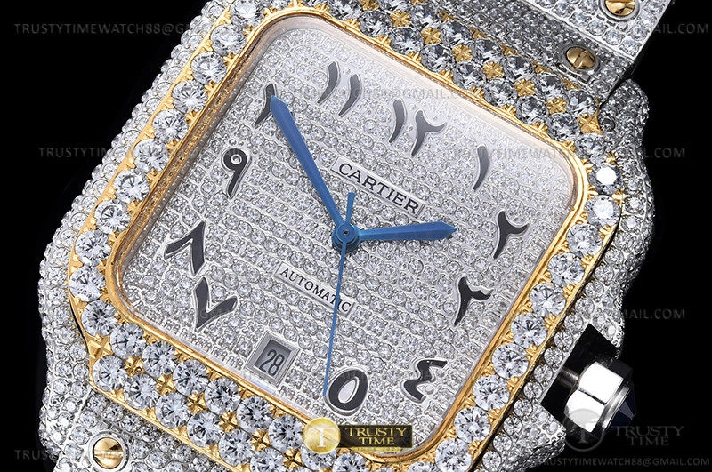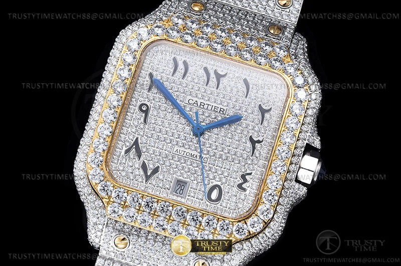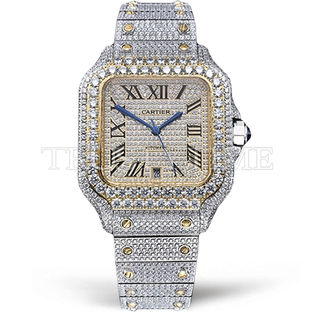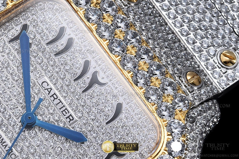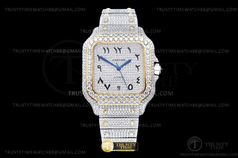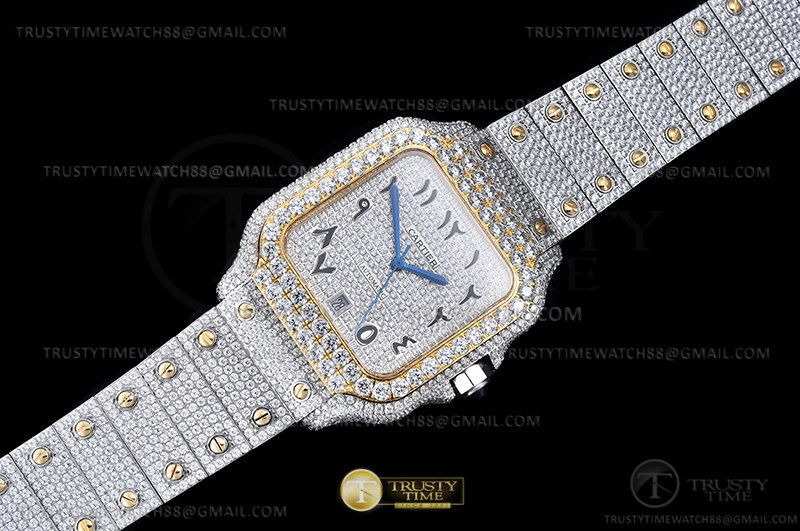 Часы Cartier из коллекции Santos De Cartier. Классические мужские часы Cartier Santos De Cartier 40 W2SA0009 Diamonds премиального качества (Артикул магазина: CR-0946) оснащены надежным автоматическим механизмом с автоподзаводом (работает от амплитуды движения руки) калибра MY8215, в котором реализованы следующие функции: часовая, минутная и секундная стрелки, а так же дата. Квадратный корпус часов комбинированного сталь с желтого золота цвета, имеющий размер 40 мм и высоту 12 мм превосходно дополнит образ и украсит запястье своего обладателя. Для изготовления часов Cartier Santos De Cartier 40 W2SA0009 Diamonds предлагаемых в нашем интернет-магазине, применяются нержавеющая сталь 316L высокого качества (Швейцарский стандарт), а так же сапфировое стекло высокой прочности, благодаря чему обеспечивается максимальная защита от сколов и механических повреждений. Отличительной чертой данной модели является серебристый циферблат, часовые индексы которого обеспечивают Арабские символы. Завершает образ браслет из нержавеющей стали комбинированного сталь с желтым золотом цвета с фирменной раскладывающейся застежкой Cartier. Водонепроницаемость данной модели составляет 30М (WR30) – допускается минимальное воздействие с водой.