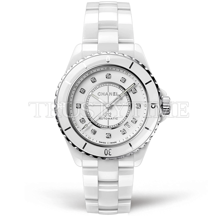 Часы Chanel из коллекции J-12. Классические женские часы Chanel J-12 38 H5705 премиального качества (Артикул магазина: CN-0238) оснащены надежным автоматическим механизмом с автоподзаводом (работает от амплитуды движения руки) калибра 12.1, в котором реализованы следующие функции: часовая, минутная и секундная стрелки, а так же дата. Круглый корпус часов белого цвета, имеющий размер 38 мм и высоту 12.7 мм превосходно дополнит образ и украсит запястье своего обладателя. Для изготовления часов Chanel J-12 38 H5705 предлагаемых в нашем интернет-магазине, применяются керамика высокого качества (Швейцарский стандарт), а так же сапфировое стекло высокой прочности, благодаря чему обеспечивается максимальная защита от сколов и механических повреждений. Отличительной чертой данной модели является белый циферблат, часовые индексы которого обеспечивают камни. Завершает образ керамический браслет белого цвета с фирменной раскладывающейся застежкой Chanel. Водонепроницаемость данной модели составляет 30М (WR30) – допускается минимальное воздействие с водой.