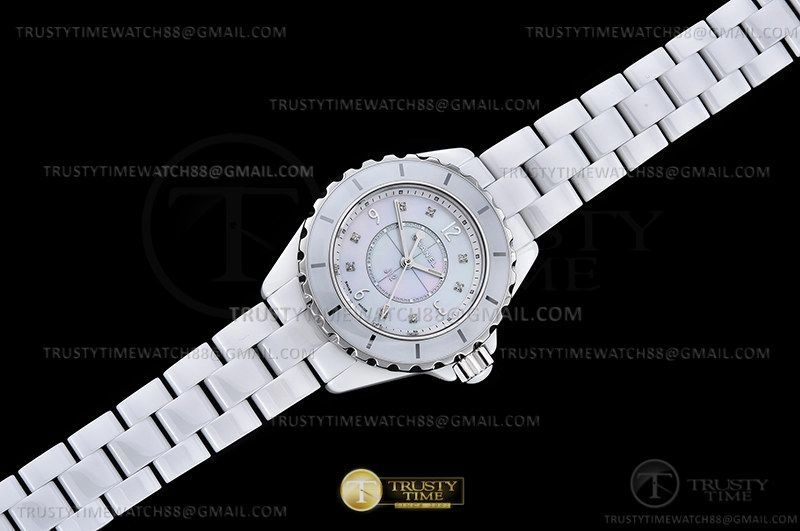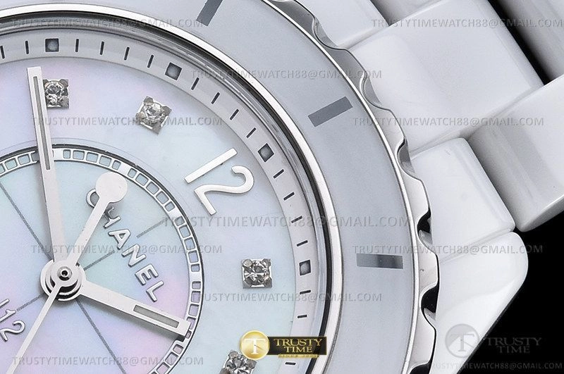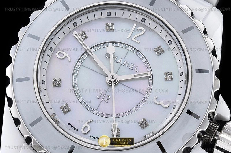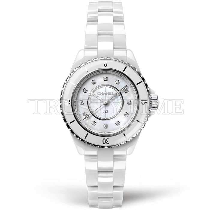 Часы Chanel из коллекции J-12. Классические женские часы Chanel J-12 33 H2422 премиального качества (Артикул магазина: CN-0250) оснащены надежным кварцевым механизмом (работает от батареи) калибра ETA.956.612, в котором реализованы следующие функции: часовая, минутная и секундная стрелки, а так же максимально простой функционал без усложнений. Круглый корпус часов белого цвета, имеющий размер 33 мм и высоту 11 мм превосходно дополнит образ и украсит запястье своего обладателя. Для изготовления часов Chanel J-12 33 H2422 предлагаемых в нашем интернет-магазине, применяются керамика высокого качества (Швейцарский стандарт), а так же сапфировое стекло высокой прочности, благодаря чему обеспечивается максимальная защита от сколов и механических повреждений. Отличительной чертой данной модели является перламутровый циферблат, часовые индексы которого обеспечивают камни. Завершает образ керамический браслет белого цвета с фирменной раскладывающейся застежкой Chanel. Водонепроницаемость данной модели составляет 30М (WR30) – допускается минимальное воздействие с водой.