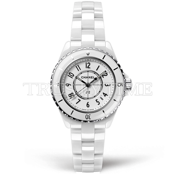 Часы Chanel из коллекции J-12. Классические женские часы Chanel J-12 33 H0968 премиального качества (Артикул магазина: CN-0253) оснащены надежным кварцевым механизмом (работает от батареи) калибра ETA.956.612, в котором реализованы следующие функции: часовая, минутная и секундная стрелки, а так же дата. Круглый корпус часов белого цвета, имеющий размер 33 мм и высоту 11 мм превосходно дополнит образ и украсит запястье своего обладателя. Для изготовления часов Chanel J-12 33 H0968 предлагаемых в нашем интернет-магазине, применяются керамика высокого качества (Швейцарский стандарт), а так же сапфировое стекло высокой прочности, благодаря чему обеспечивается максимальная защита от сколов и механических повреждений. Отличительной чертой данной модели является белый циферблат, часовые индексы которого обеспечивают арабские цифры. Завершает образ керамический браслет белого цвета с фирменной раскладывающейся застежкой Chanel. Водонепроницаемость данной модели составляет 30М (WR30) – допускается минимальное воздействие с водой.