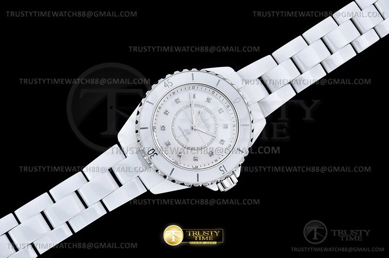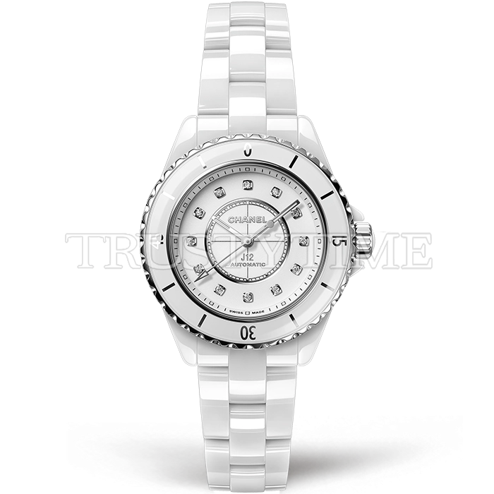 Часы Chanel из коллекции J-12. Классические женские часы Chanel J-12 33 H9741 премиального качества (Артикул магазина: CN-0294) оснащены надежным автоматическим механизмом с автоподзаводом (работает от амплитуды движения руки) калибра 12.2, в котором реализованы следующие функции: часовая, минутная и секундная стрелки, а так же максимально простой функционал без усложнений. Круглый корпус часов белого цвета, имеющий размер 33 мм и высоту 13 мм превосходно дополнит образ и украсит запястье своего обладателя. Для изготовления часов Chanel J-12 33 H9741 предлагаемых в нашем интернет-магазине, применяются керамика высокого качества (Швейцарский стандарт), а так же сапфировое стекло высокой прочности, благодаря чему обеспечивается максимальная защита от сколов и механических повреждений. Отличительной чертой данной модели является белый циферблат, часовые индексы которого обеспечивают камни. Завершает образ керамический браслет белого цвета с фирменной раскладывающейся застежкой Chanel. Водонепроницаемость данной модели составляет 30М (WR30) – допускается минимальное воздействие с водой.