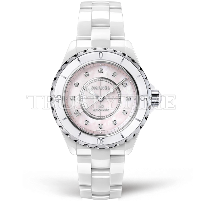 Часы Chanel из коллекции J-12. Классические женские часы Chanel J-12 38 H5514 премиального качества (Артикул магазина: CN-0281) оснащены надежным автоматическим механизмом с автоподзаводом (работает от амплитуды движения руки) калибра ETA2892, в котором реализованы следующие функции: часовая, минутная и секундная стрелки, а так же дата. Круглый корпус часов белого цвета, имеющий размер 38 мм и высоту 11.4 мм превосходно дополнит образ и украсит запястье своего обладателя. Для изготовления часов Chanel J-12 38 H5514 предлагаемых в нашем интернет-магазине, применяются керамика высокого качества (Швейцарский стандарт), а так же сапфировое стекло высокой прочности, благодаря чему обеспечивается максимальная защита от сколов и механических повреждений. Отличительной чертой данной модели является розовый циферблат, часовые индексы которого обеспечивают камни. Завершает образ керамический браслет белого цвета с фирменной раскладывающейся застежкой Chanel. Водонепроницаемость данной модели составляет 30М (WR30) – допускается минимальное воздействие с водой.