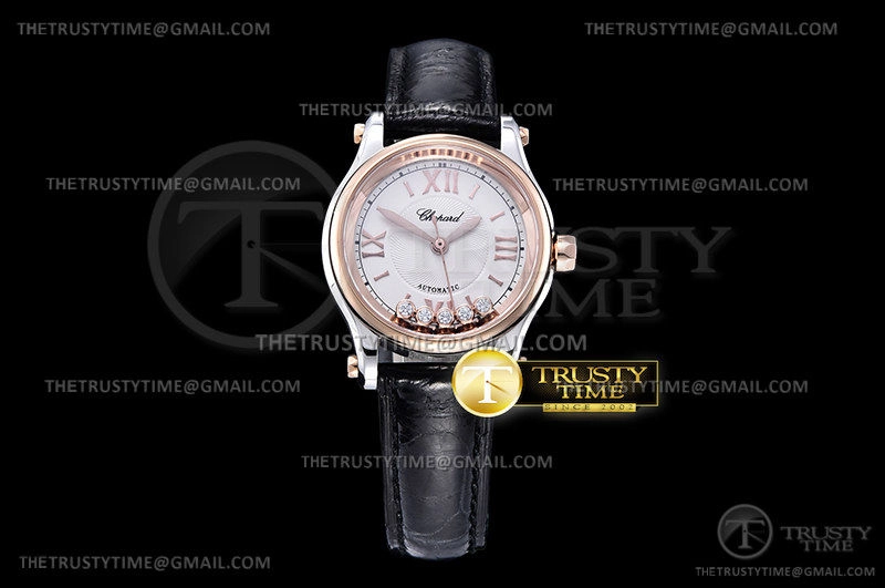 Часы Chopard из коллекции Happy Sports. Классические женские часы Chopard Happy Sports 30mm 278573-6013 премиального качества (Артикул магазина: CH-0174) оснащены надежным автоматическим механизмом с автоподзаводом (работает от амплитуды движения руки) калибра ETA2892-2, в котором реализованы следующие функции: часовая, минутная и секундная стрелки, а так же максимально простой функционал без усложнений. Круглый корпус часов комбинированного сталь с розового золота цвета, имеющий размер 30 мм и высоту 9 мм превосходно дополнит образ и украсит запястье своего обладателя. Для изготовления часов Chopard Happy Sports 30mm 278573-6013 предлагаемых в нашем интернет-магазине, применяются нержавеющая сталь 316F высокого качества (Швейцарский стандарт), а так же сапфировое стекло высокой прочности, благодаря чему обеспечивается максимальная защита от сколов и механических повреждений. Отличительной чертой данной модели является серебристый циферблат, часовые индексы которого обеспечивают римские цифры. Завершает образ кожаный ремешок черного цвета с фирменной классической застежкой Chopard. Водонепроницаемость данной модели составляет 30М (WR30) – допускается минимальное воздействие с водой.
