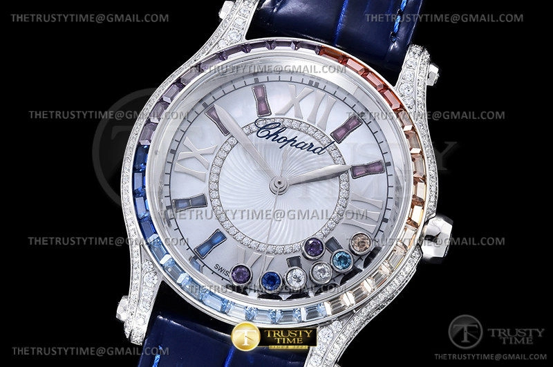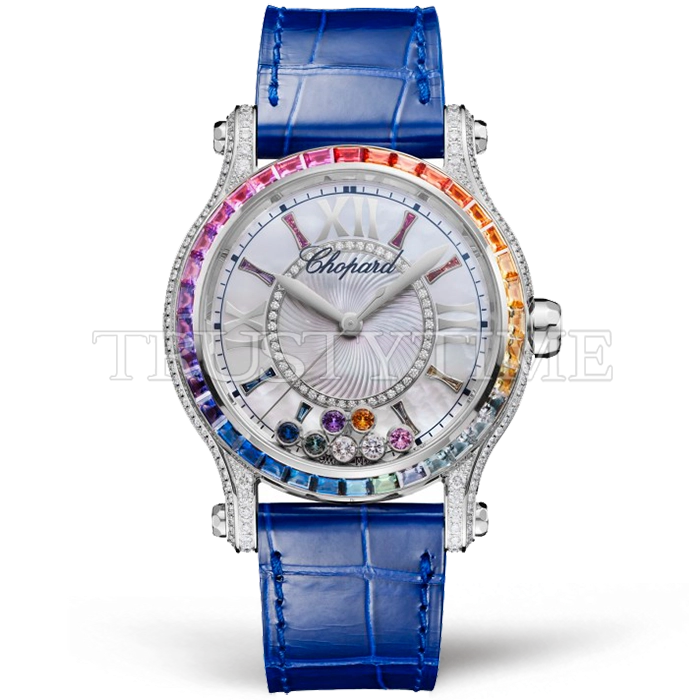 Часы Chopard из коллекции Happy Sports. Классические женские часы Chopard Happy Sports 36mm 274891-1007 премиального качества (Артикул магазина: CH-0180) оснащены надежным автоматическим механизмом с автоподзаводом (работает от амплитуды движения руки) калибра ETA2892-2, в котором реализованы следующие функции: часовая, минутная и секундная стрелки, а так же максимально простой функционал без усложнений. Круглый корпус часов стального цвета, имеющий размер 36 мм и высоту 12.5 мм превосходно дополнит образ и украсит запястье своего обладателя. Для изготовления часов Chopard Happy Sports 36mm 274891-1007 предлагаемых в нашем интернет-магазине, применяются нержавеющая сталь 316F высокого качества (Швейцарский стандарт), а так же сапфировое стекло высокой прочности, благодаря чему обеспечивается максимальная защита от сколов и механических повреждений. Отличительной чертой данной модели является перламутровый циферблат, часовые индексы которого обеспечивают камни, часовые индексы которого обеспечивают римские цифры. Завершает образ кожаный ремешок синего цвета с фирменной классической застежкой Chopard. Водонепроницаемость данной модели составляет 30М (WR30) – допускается минимальное воздействие с водой.