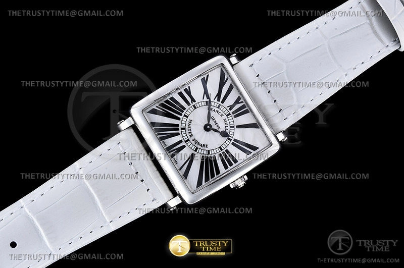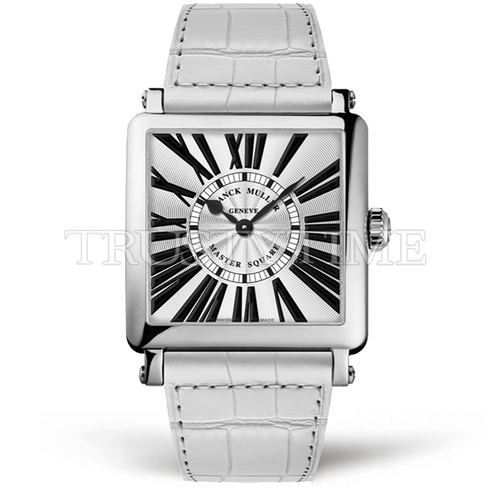 Часы Franck Muller из коллекции Master Square. Классические женские часы Franck Muller Master Square Master Square 6002-M-QZ-R премиального качества (Артикул магазина: FM-0655) оснащены надежным кварцевым механизмом (работает от батареи) калибра Swiss Quartz ETA, в котором реализованы следующие функции: часова и минутка стрелки, а так же максимально простой функционал без усложнений. Квадратный корпус часов стального цвета, имеющий размер 32.5 мм X 32.5 мм и высоту 10 мм превосходно дополнит образ и украсит запястье своего обладателя. Для изготовления часов Franck Muller Master Square Master Square 6002-M-QZ-R предлагаемых в нашем интернет-магазине, применяются нержавеющая сталь 316L высокого качества (Швейцарский стандарт), а так же сапфировое стекло высокой прочности, благодаря чему обеспечивается максимальная защита от сколов и механических повреждений. Отличительной чертой данной модели является серебристый циферблат, часовые индексы которого обеспечивают римские цифры. Завершает образ кожаный ремешок белого цвета с фирменной классической застежкой Franck Muller. Водонепроницаемость данной модели составляет 30М (WR30) – допускается минимальное воздействие с водой.