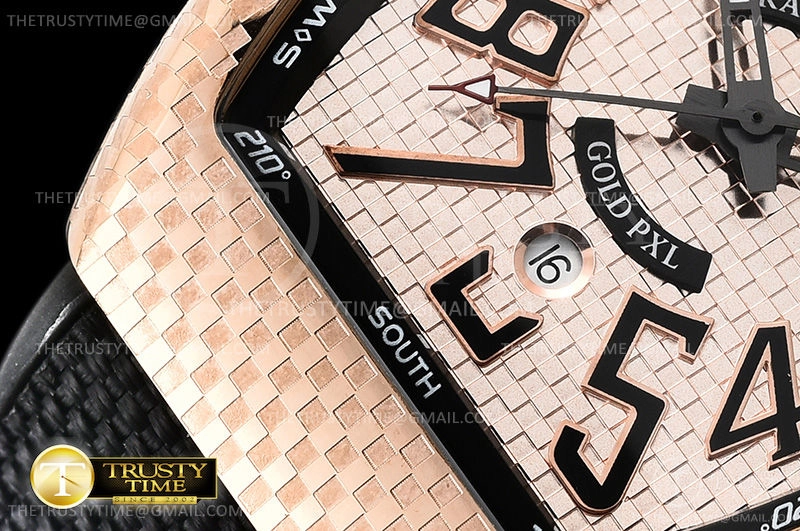 Часы Franck Muller из коллекции Vanguard. Классические мужские часы Franck Muller Vanguard PXL V45-SCDT-PXL-RG премиального качества (Артикул магазина: FM-0635) оснащены надежным автоматическим механизмом с автоподзаводом (работает от амплитуды движения руки) калибра ETA2824-2, в котором реализованы следующие функции: часовая, минутная и секундная стрелки, а так же дата. Бочкообразный корпус часов розового цвета, имеющий размер 44 мм x 54 мм и высоту 13 мм превосходно дополнит образ и украсит запястье своего обладателя. Для изготовления часов Franck Muller Vanguard PXL V45-SCDT-PXL-RG предлагаемых в нашем интернет-магазине, применяются нержавеющая сталь 316L высокого качества (Швейцарский стандарт), а так же сапфировое стекло высокой прочности, благодаря чему обеспечивается максимальная защита от сколов и механических повреждений. Отличительной чертой данной модели является золотой циферблат, часовые индексы которого обеспечивают арабские цифры. Завершает образ нейлоновый ремешок черного цвета с фирменной раскладывающейся застежкой Franck Muller. Водонепроницаемость данной модели составляет 30М (WR30) – допускается минимальное воздействие с водой.