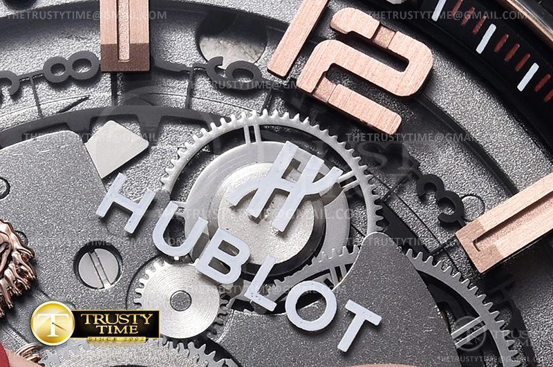 Часы Hublot из коллекции Big Bang Ferrari. Спортивные мужские часы Hublot Big Bang Ferrari "King Carbon Gold" 401.OQ.0123.VR премиального качества (Артикул магазина: HB-0421) оснащены надежным автоматическим механизмом с автоподзаводом (работает от амплитуды движения руки) калибра HUB1288, в котором реализованы следующие функции: часовая, минутная и секундная стрелки, а так же хронограф, дата. Круглый корпус часов розового цвета, имеющий размер 45 мм и высоту 17 мм превосходно дополнит образ и украсит запястье своего обладателя. Для изготовления часов Hublot Big Bang Ferrari "King Carbon Gold" 401.OQ.0123.VR предлагаемых в нашем интернет-магазине, применяются нержавеющая сталь 316F высокого качества (Швейцарский стандарт), а так же сапфировое стекло высокой прочности, благодаря чему обеспечивается максимальная защита от сколов и механических повреждений. Отличительной чертой данной модели является скелетонизированный циферблат, часовые индексы которого обеспечивают часовые метки. Завершает образ кожаный ремешок черного цвета с фирменной раскладывающейся застежкой Hublot. Водонепроницаемость данной модели составляет 30М (WR30) – допускается минимальное воздействие с водой.