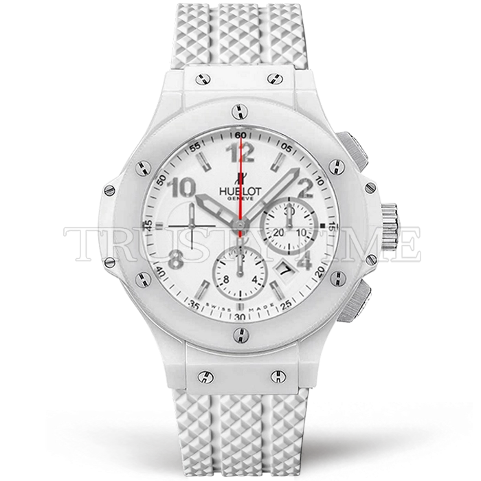 Часы Hublot из коллекции Big Bang. Спортивные мужские часы Hublot Big Bang Aspen 44mm 341.CH.230.RW премиального качества (Артикул магазина: HB-0842) оснащены надежным автоматическим механизмом с автоподзаводом (работает от амплитуды движения руки) калибра HUB4100, в котором реализованы следующие функции: часовая, минутная и секундная стрелки, а так же хронограф, дата. Круглый корпус часов белого цвета, имеющий размер 44.5 мм и высоту 14.5 мм превосходно дополнит образ и украсит запястье своего обладателя. Для изготовления часов Hublot Big Bang Aspen 44mm 341.CH.230.RW предлагаемых в нашем интернет-магазине, применяются керамика высокого качества (Швейцарский стандарт), а так же сапфировое стекло высокой прочности, благодаря чему обеспечивается максимальная защита от сколов и механических повреждений. Отличительной чертой данной модели является белый циферблат, часовые индексы которого обеспечивают арабские цифры, часовые индексы которого обеспечивают часовые метки. Завершает образ каучуковый ремешок белого цвета с фирменной раскладывающейся застежкой Hublot. Водонепроницаемость данной модели составляет 30М (WR30) – допускается минимальное воздействие с водой.